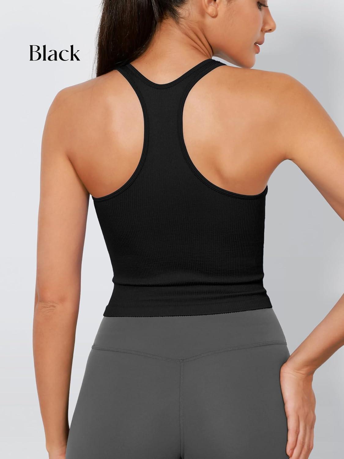ODODOS 3-Pack Seamless Racerback Crop Tank for Women Ribbed Knit Soft Crop Tops(Black+nutria+white)