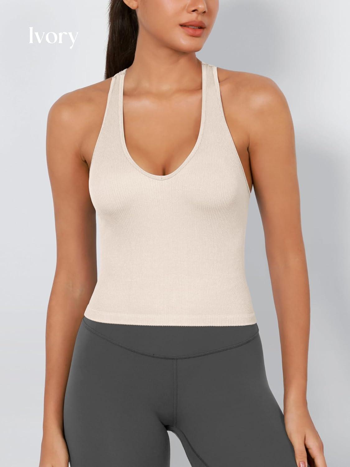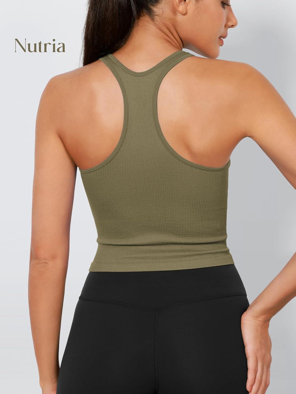 imageODODOS 3Pack Seamless Racerback Crop Tank for Women Ribbed Knit Soft Crop TopsIvorynavynutria