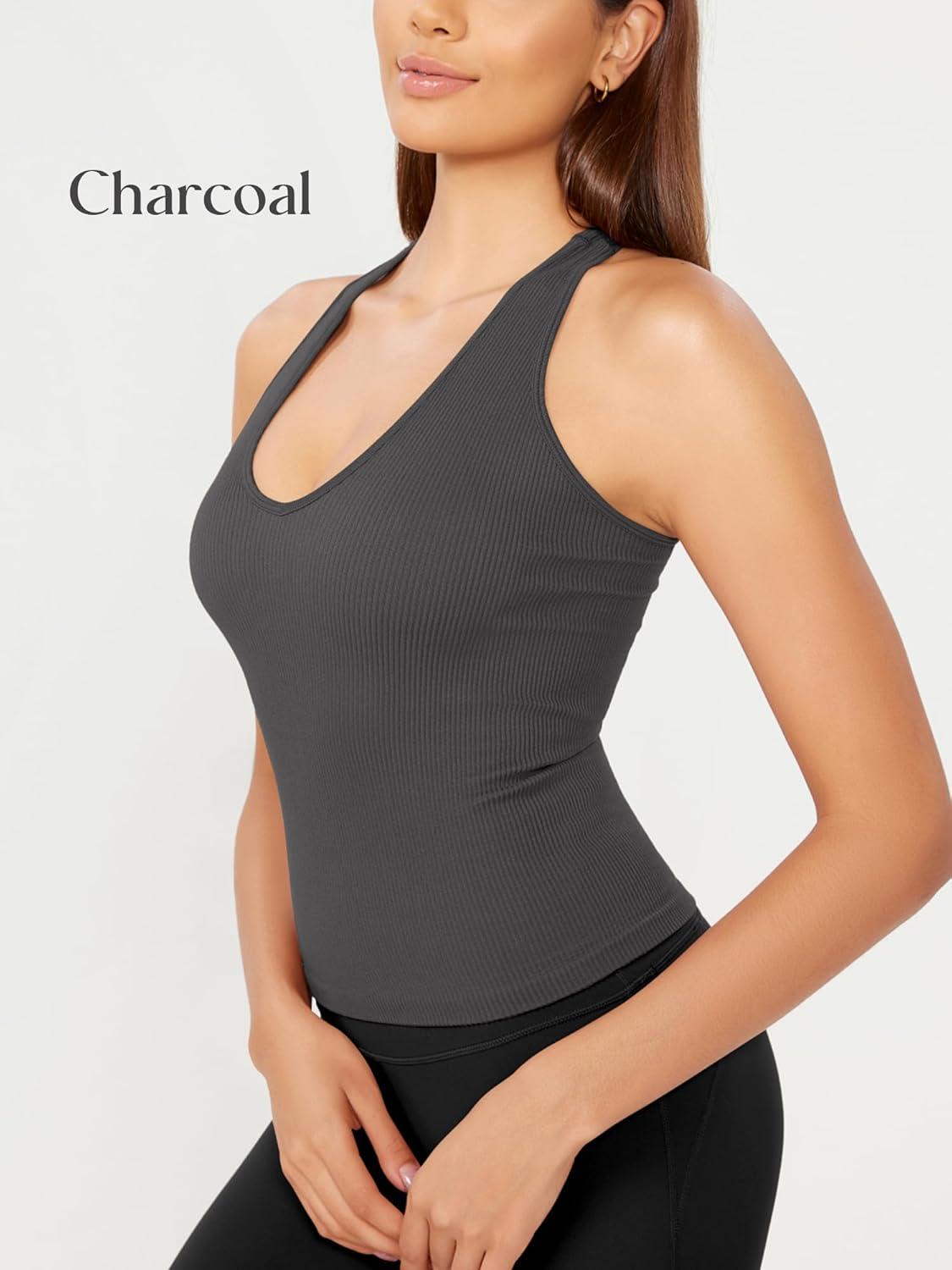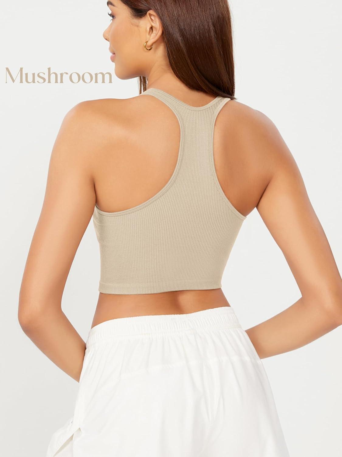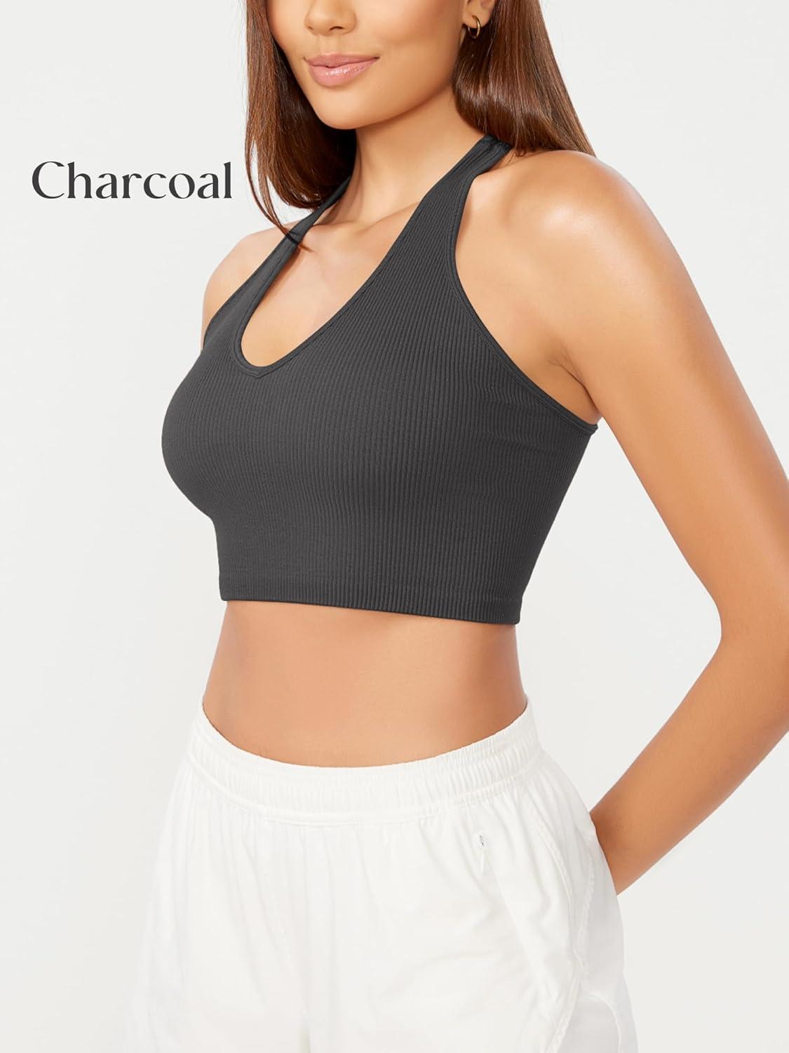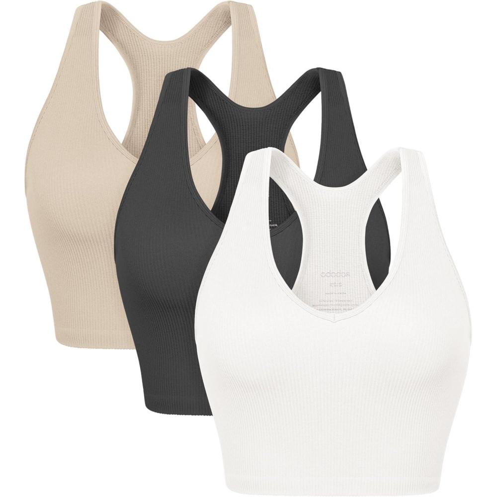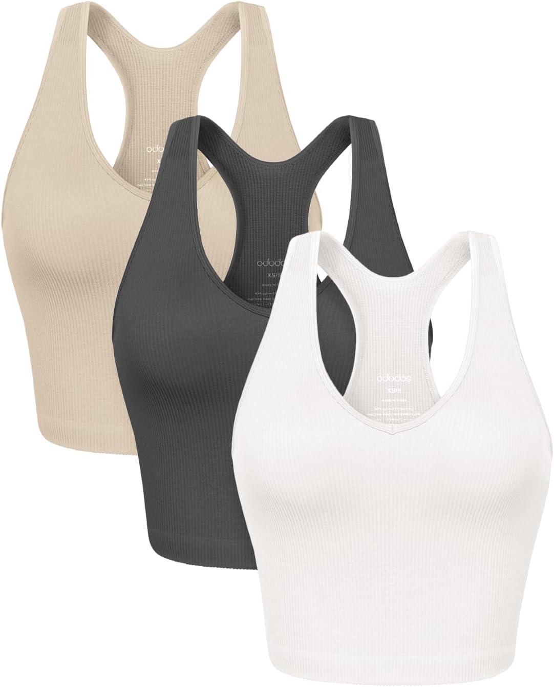 ODODOS 3-Pack Seamless Racerback Crop Tank for Women Ribbed Knit Soft Crop Tops(White+charcoal+mushroom)