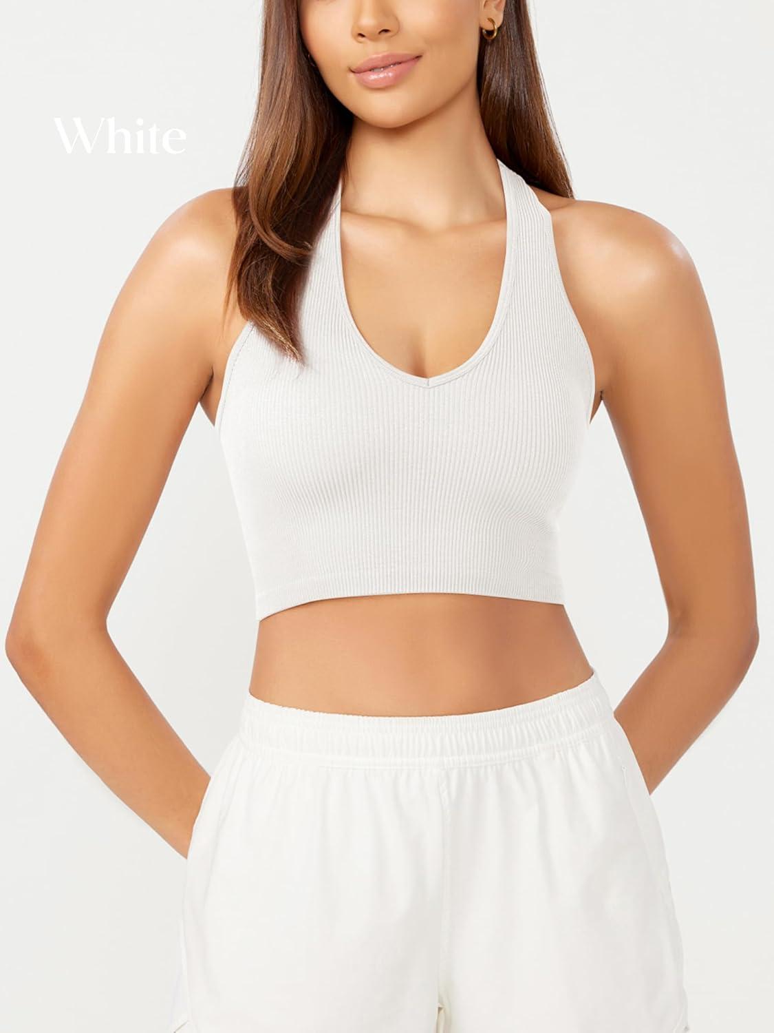 imageODODOS 3Pack Seamless Racerback Crop Tank for Women Ribbed Knit Soft Crop TopsWhitecharcoalmushroom