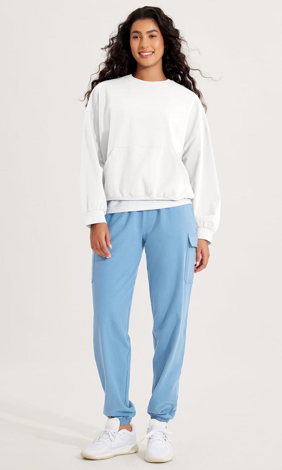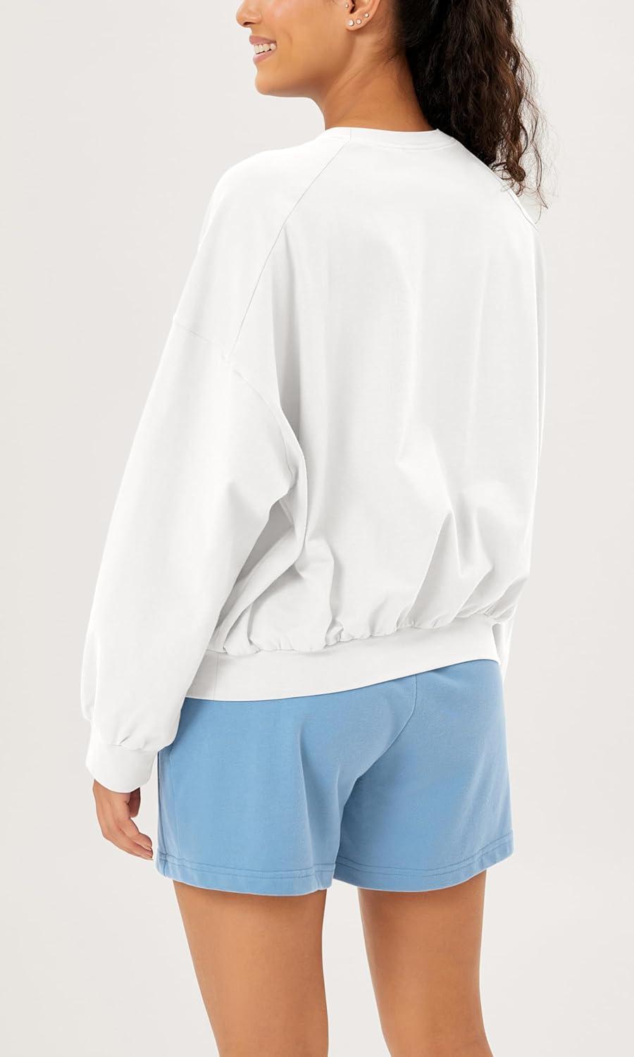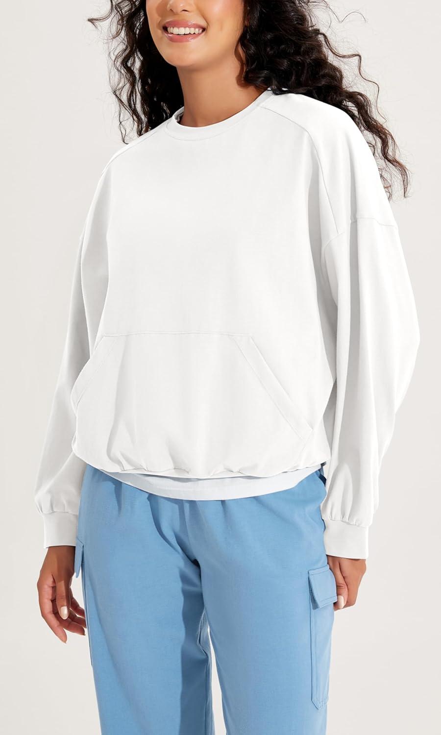 ODODOS Purevibe Cotton Oversized Sweatshirts, Women's Crew Neck Long Sleeve Pullover Tops with Kangaroo Pocket(White)