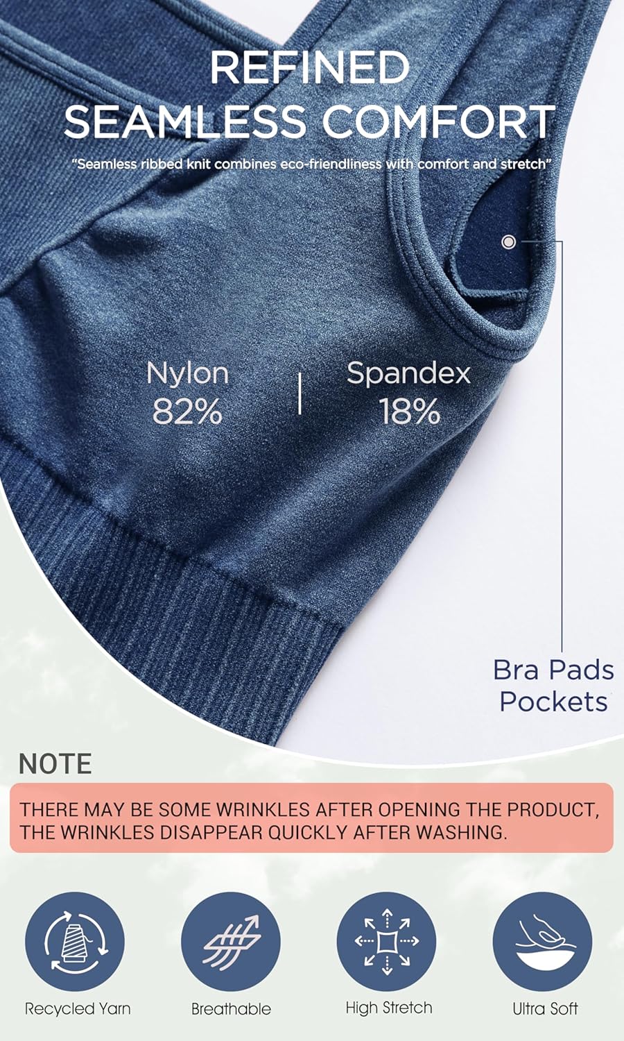 ODODOS Seamless Square Neck Sports Bra for Women Ribbed Crop Tank Casual Low Back Cropped Tops(Stone Washing Denim Blue)