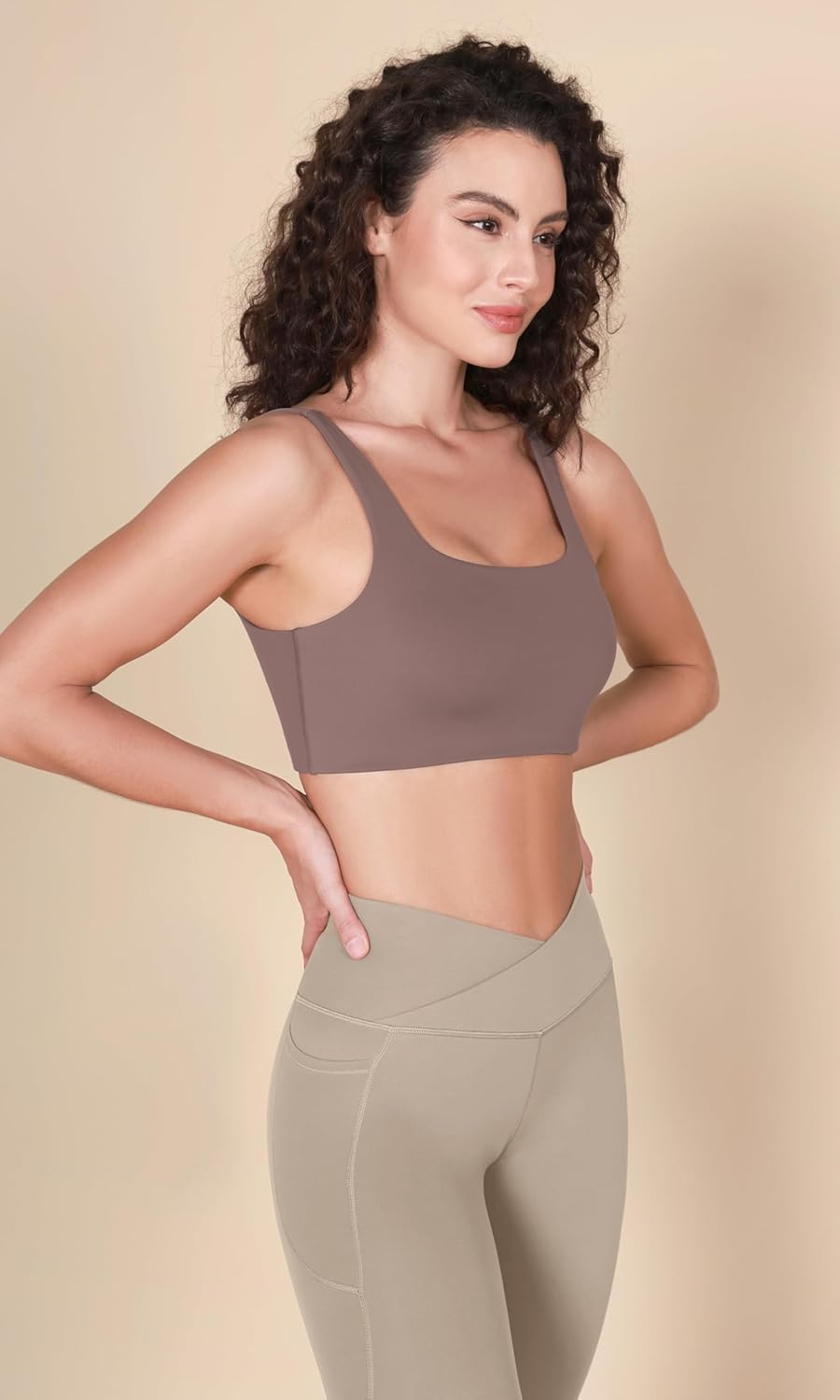 imageODODOS Square Neck Sports Bra for Women Wirefree Non Padded Yoga Tank Workout Crop TopsTaupe