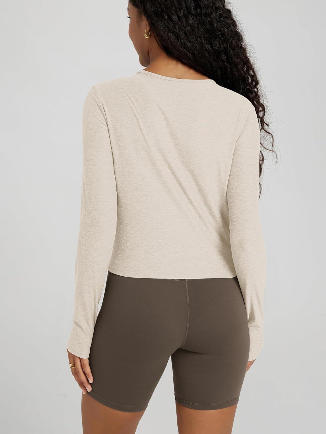 ODODOS Women’s Cardigan – Ultra Soft Stratum Tech Performance Long Sleeve Crop UPF 50+ Button Down Crewneck Top(Ecru Heather)