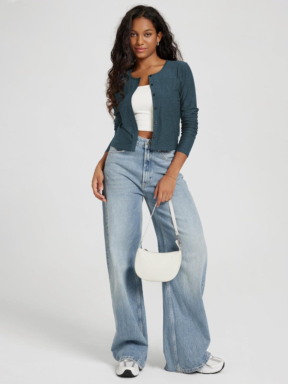 ODODOS Women's Cardigan - Ultra Soft Stratum Tech Performance Long Sleeve Crop UPF 50+ Button Down Crewneck Top(Navy Heather)