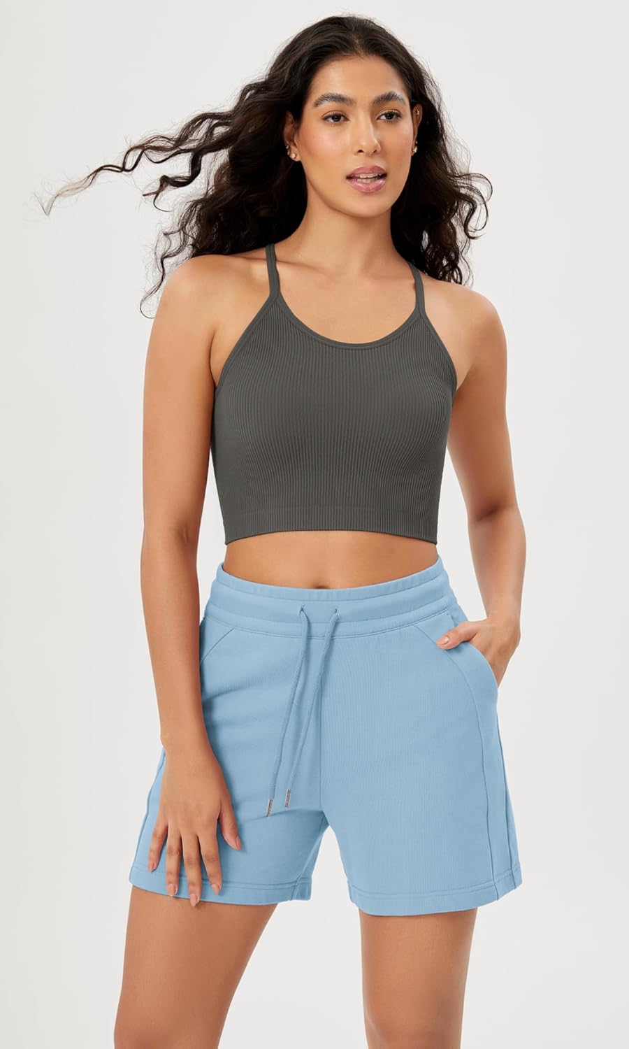 ODODOS Women’s Crop 3-Pack Washed Seamless Rib-Knit Camisole Crop Tank Tops(White+charcoal+mushroom (Long Crop))