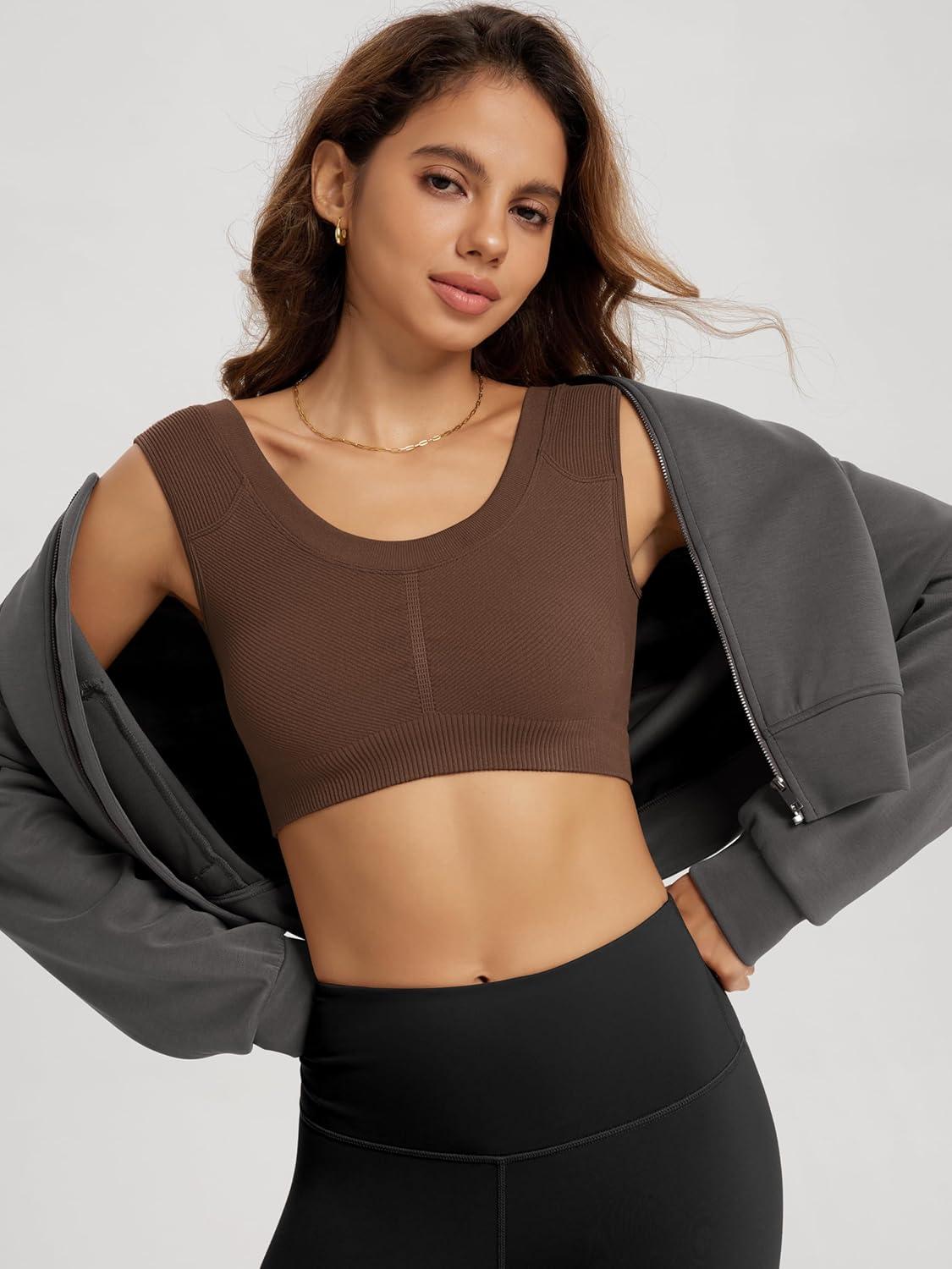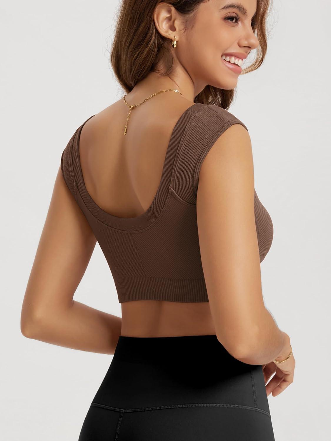 ODODOS Women's Crop Tank - Seamless Ultra Soft Ribbed Knit Scoop Neck Low Back Sleeveless Tops(Brunette)