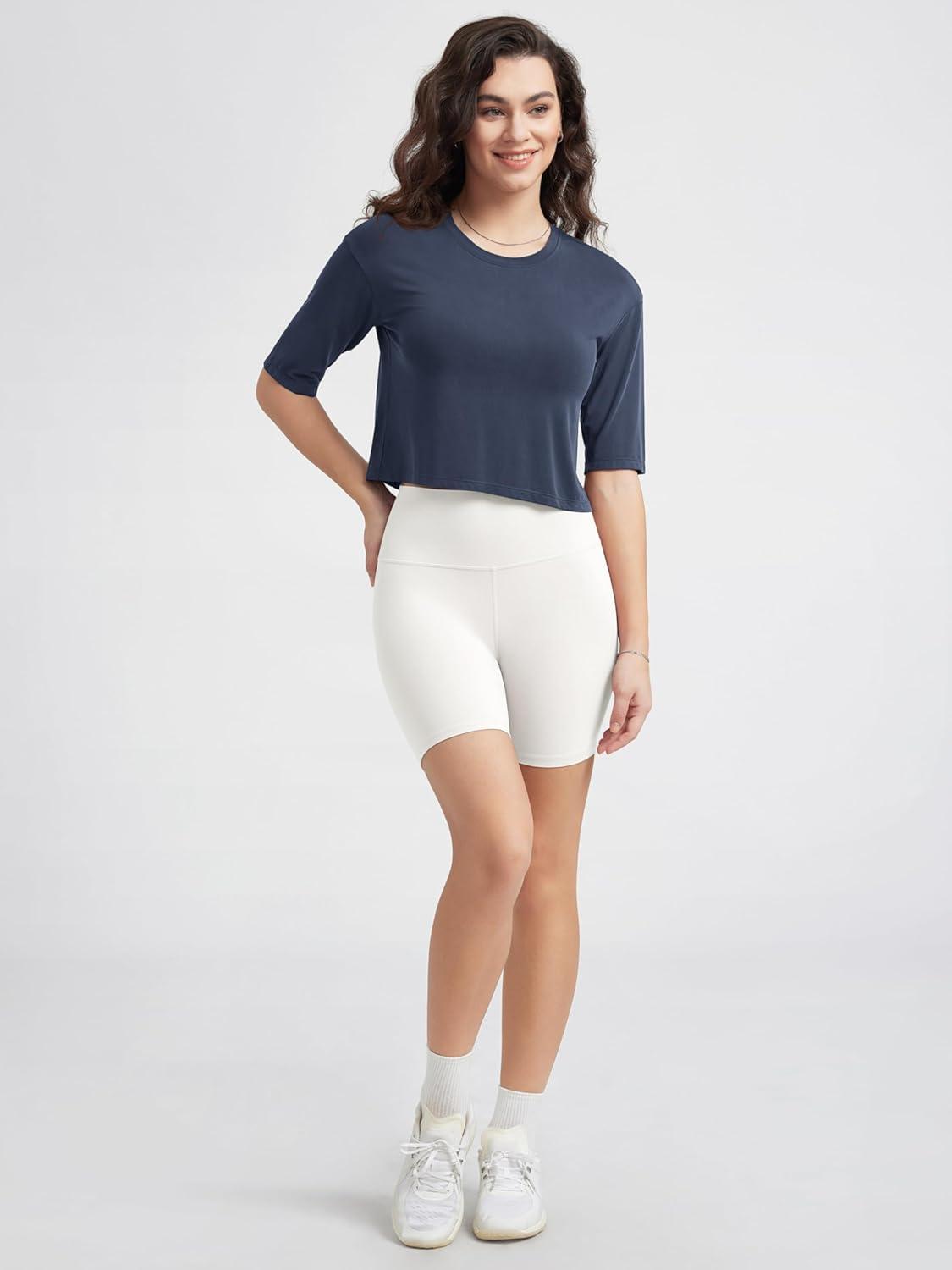 ODODOS Women’s Cropped T-Shirt – Ultra Soft Short Sleeve Top Crew Neck Relaxed Fit Casual Tee for Everyday Wear(Naval)