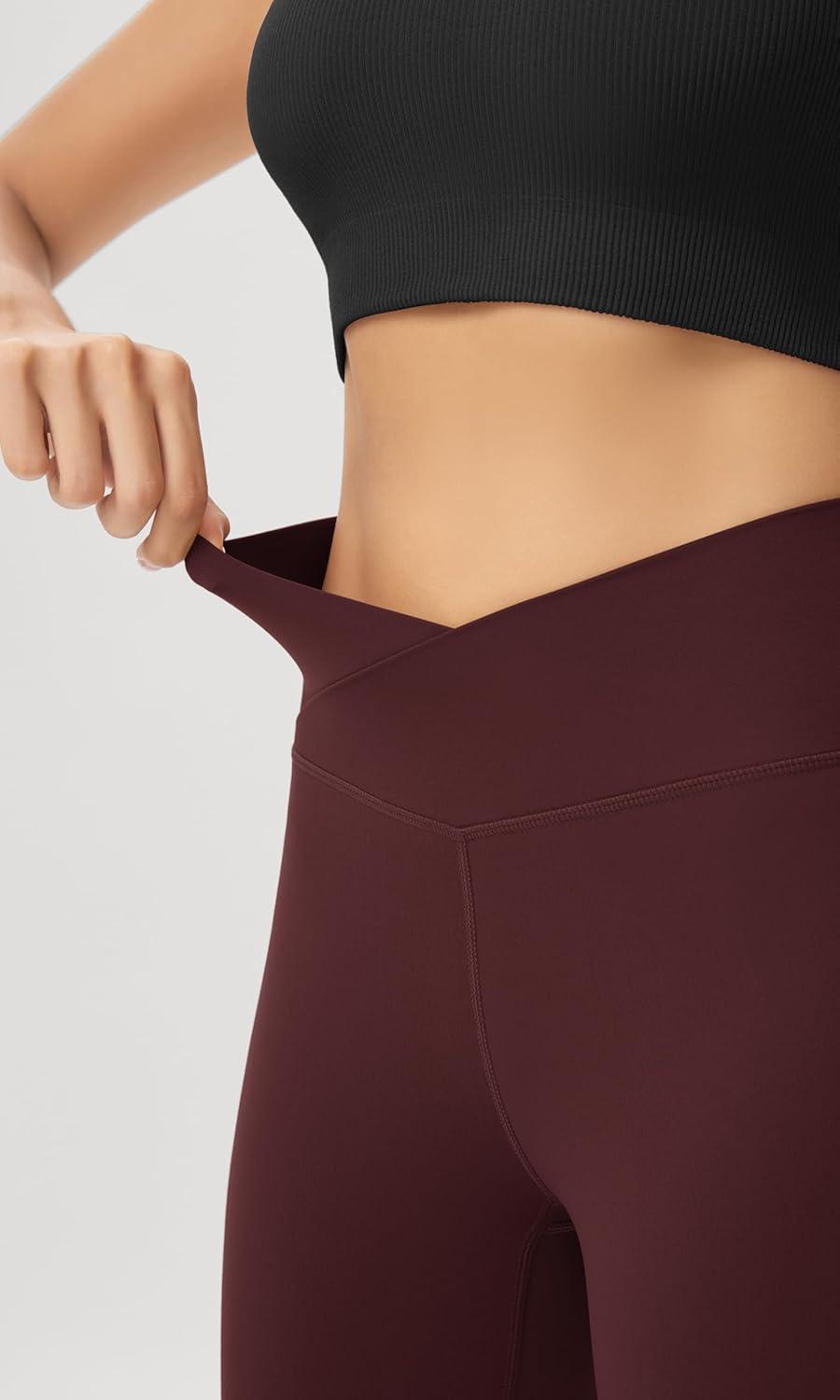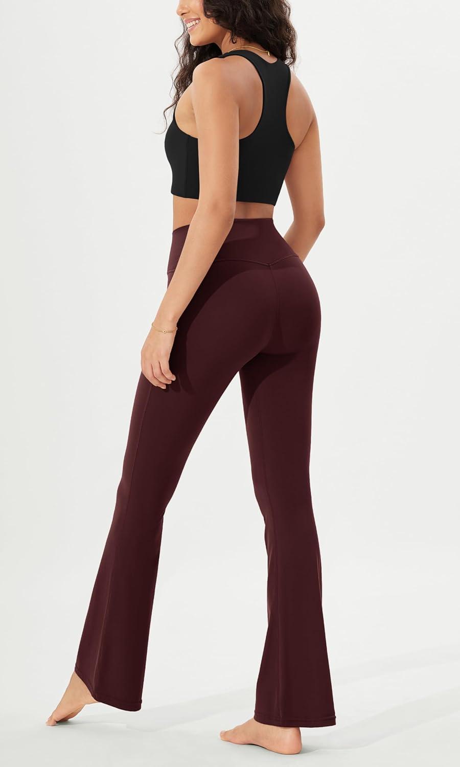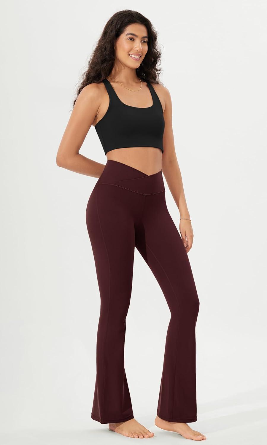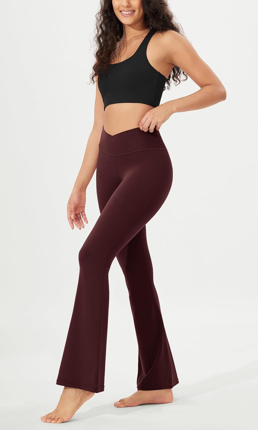 ODODOS Women’s Crossover Flared Yoga Pants Cloud Feeling Soft High Waist Bootcut Leggings with Back Pocket -30″ / 32″ Inseam(Burgundy)