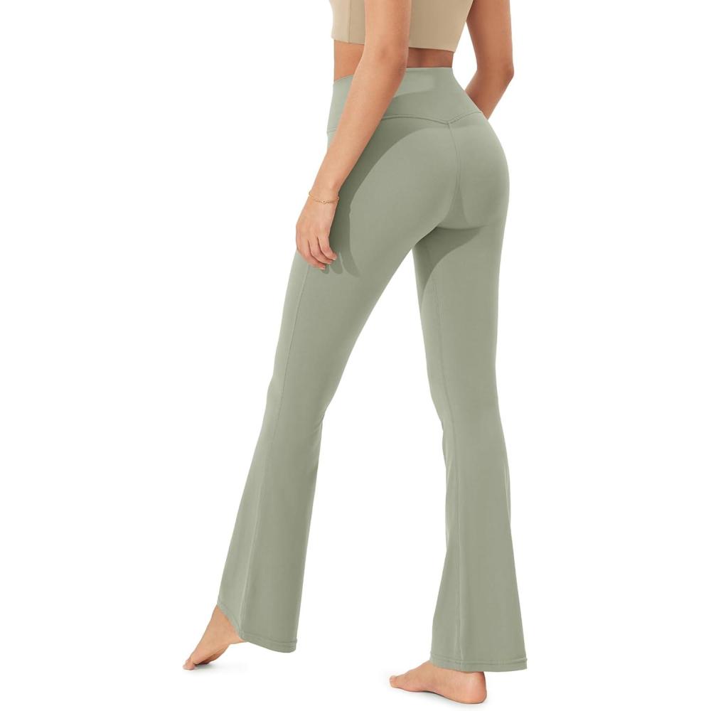 ODODOS Women’s Crossover Flared Yoga Pants Cloud Feeling Soft High Waist Bootcut Leggings with Back Pocket -30″ / 32″ Inseam(Lime Stone)