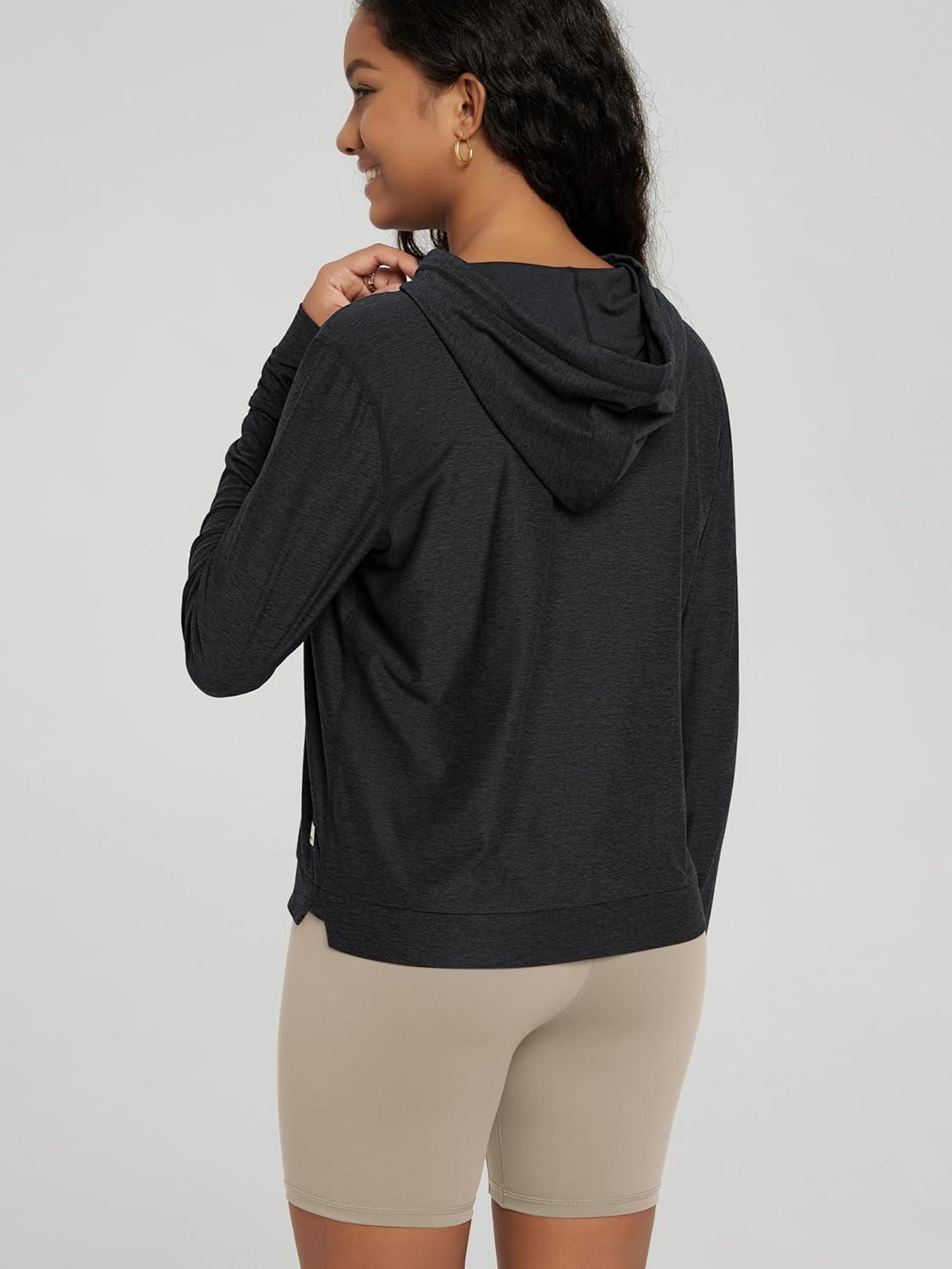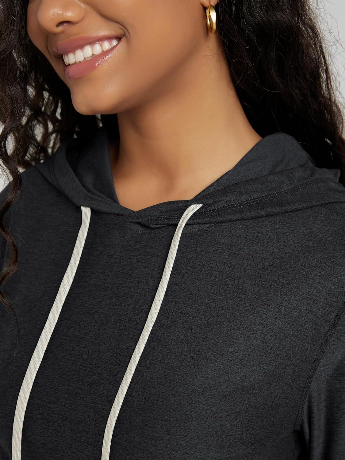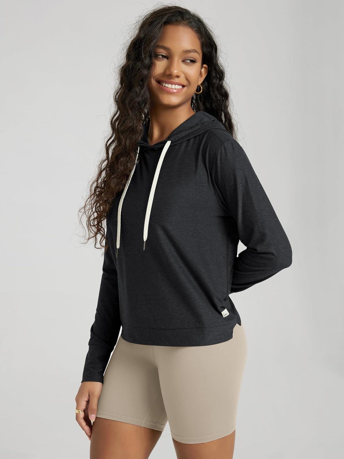 ODODOS Women's Essential Hoodie - Ultra Soft Stratum Tech Pullover UPF 50+ Moisture Wicking Long Sleeve Top(Black Heather)