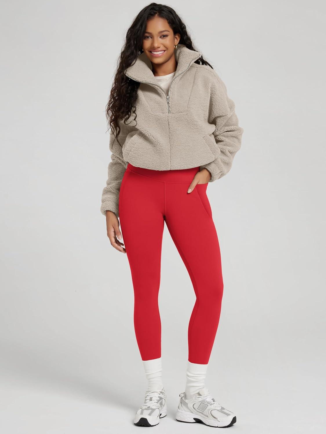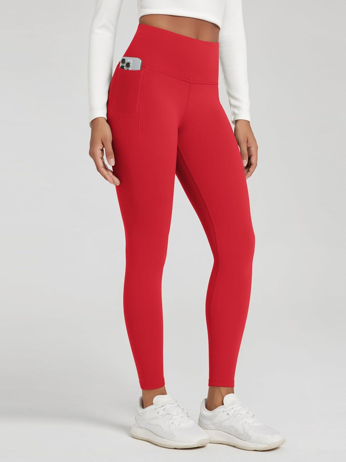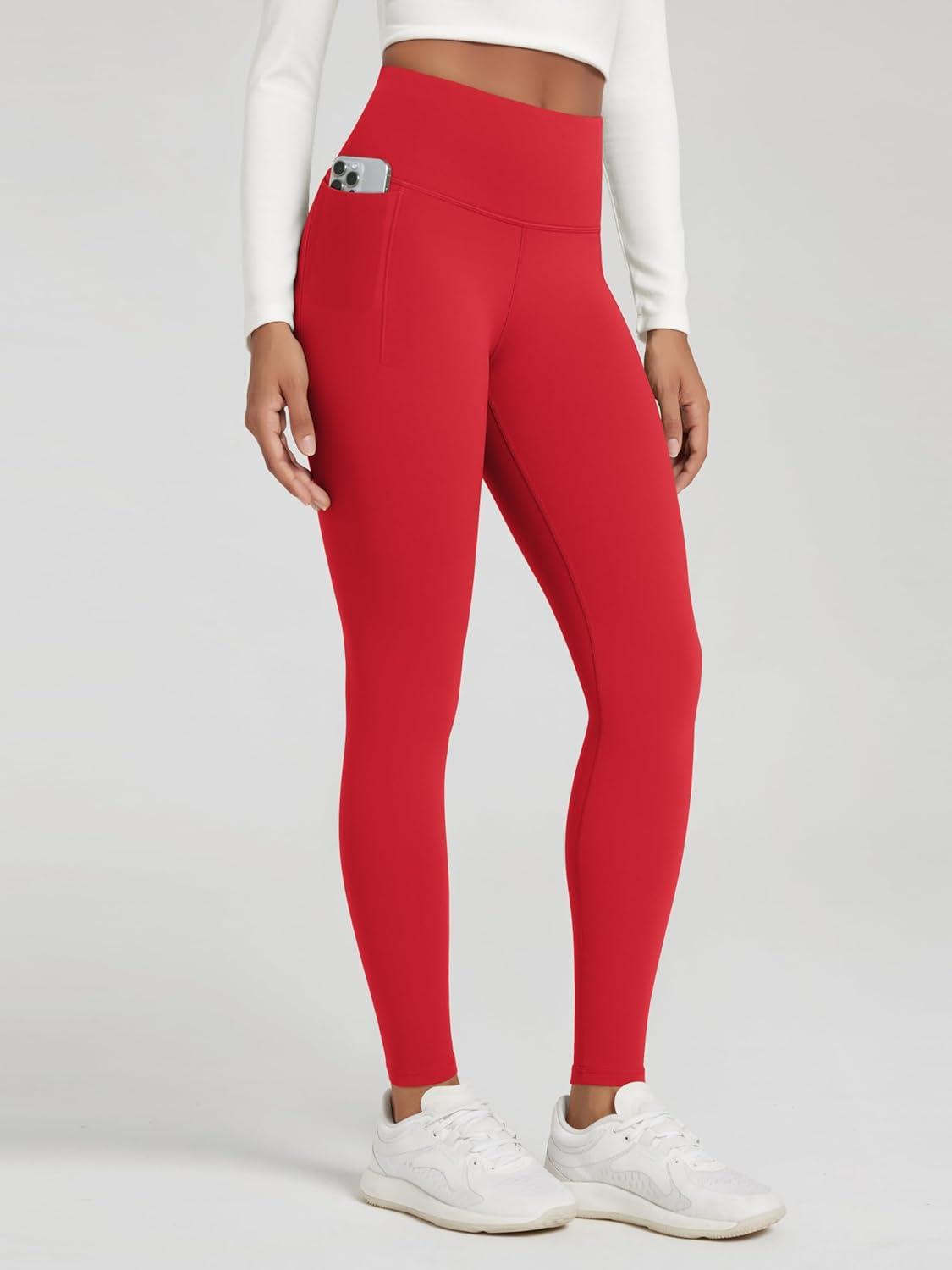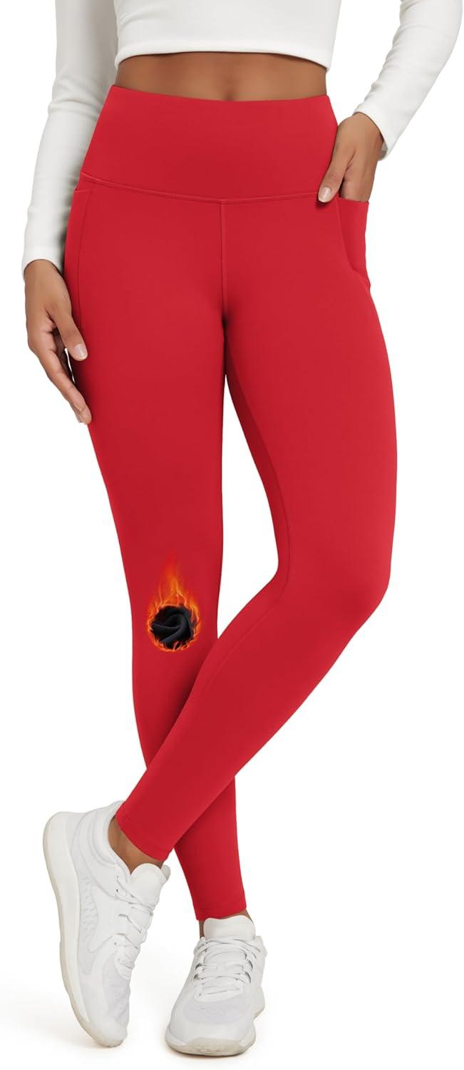 ODODOS Women’s Fleece Lined Leggings with Pockets Thermal Warm Winter Tights – 25″ / 28″ High Waisted Thick Yoga Pants(Red)