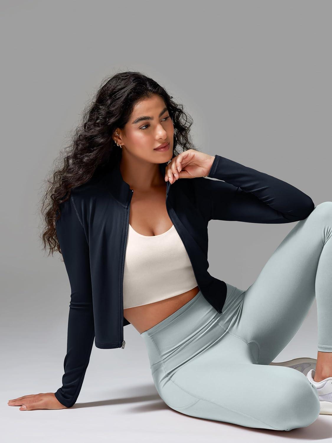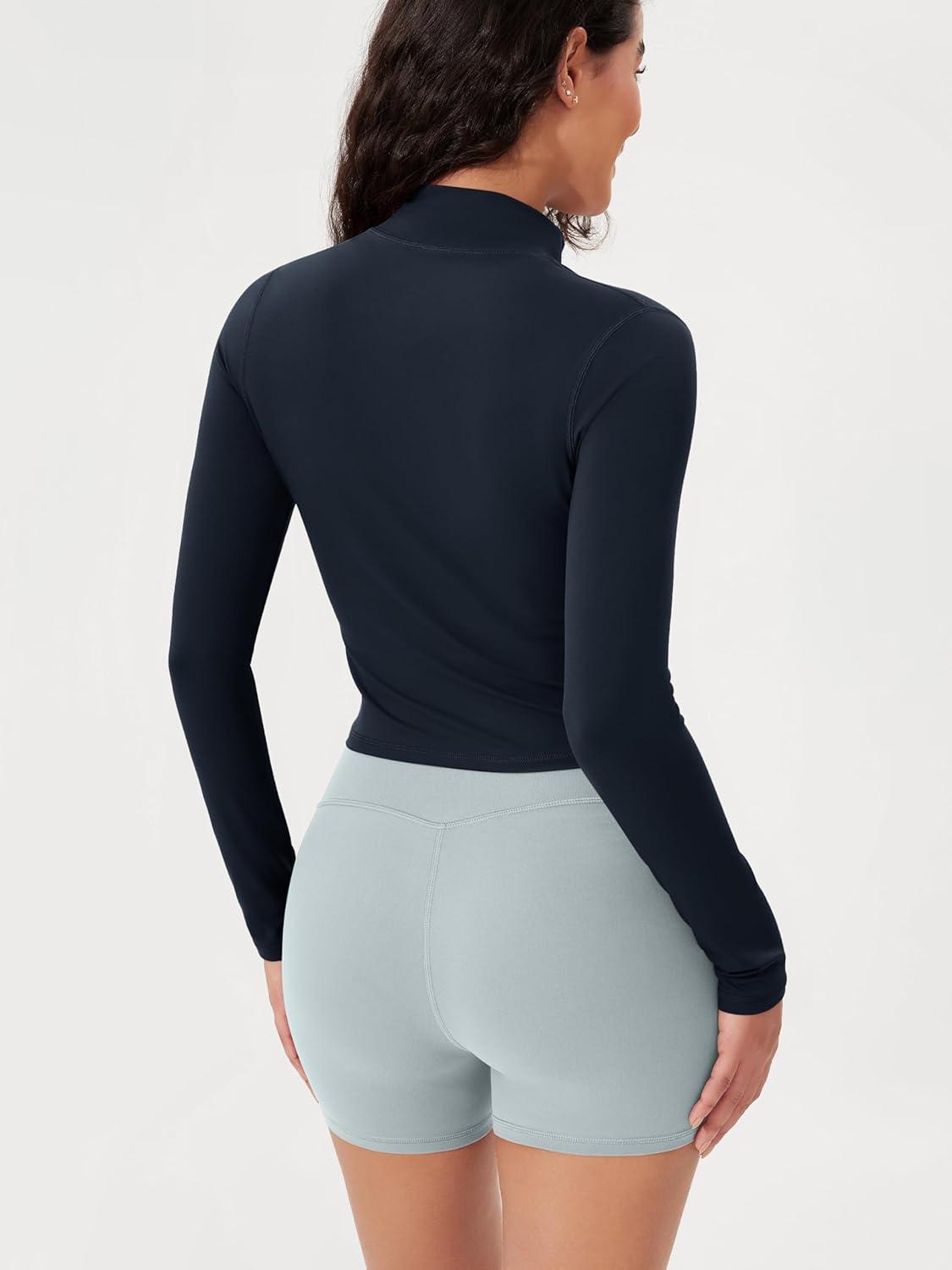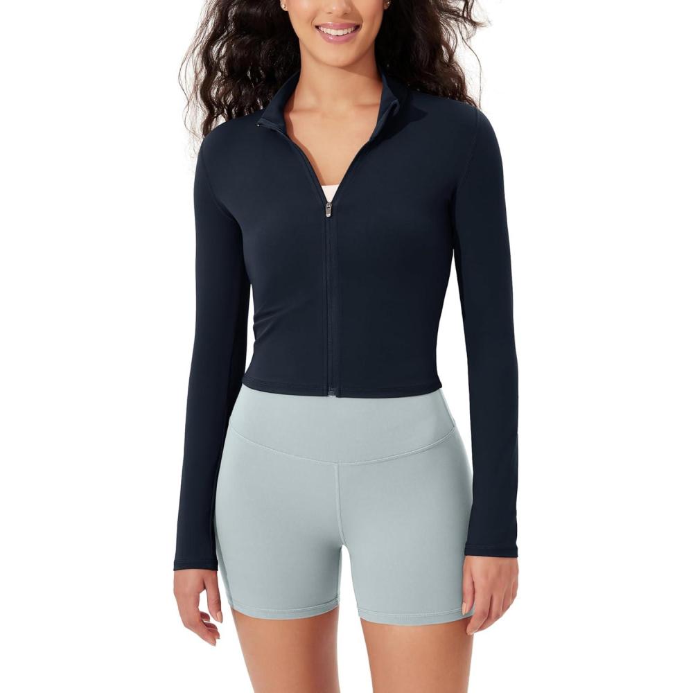 ODODOS Women’s Full-Zip Athletic Jacket Cloud Feeling Soft Long Sleeve Slim-Fit Running Gym Workout Yoga Cropped Tops(Deep Navy)