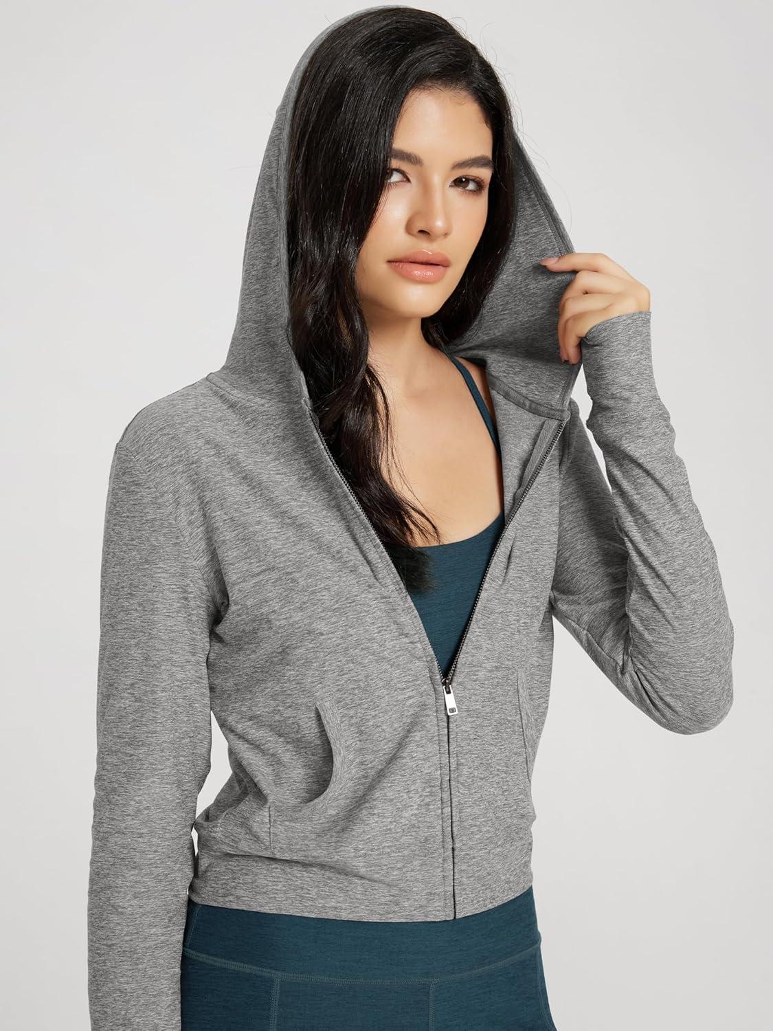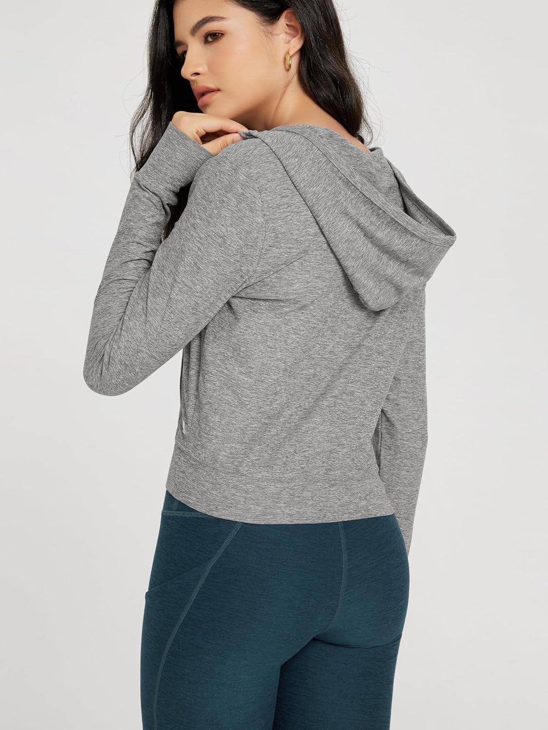 ODODOS Women's Full-Zip Cropped Hoodie – Stratum Tech Ultra Soft UPF 50+ Hooded Jacket with Pockets(Grey Heather)