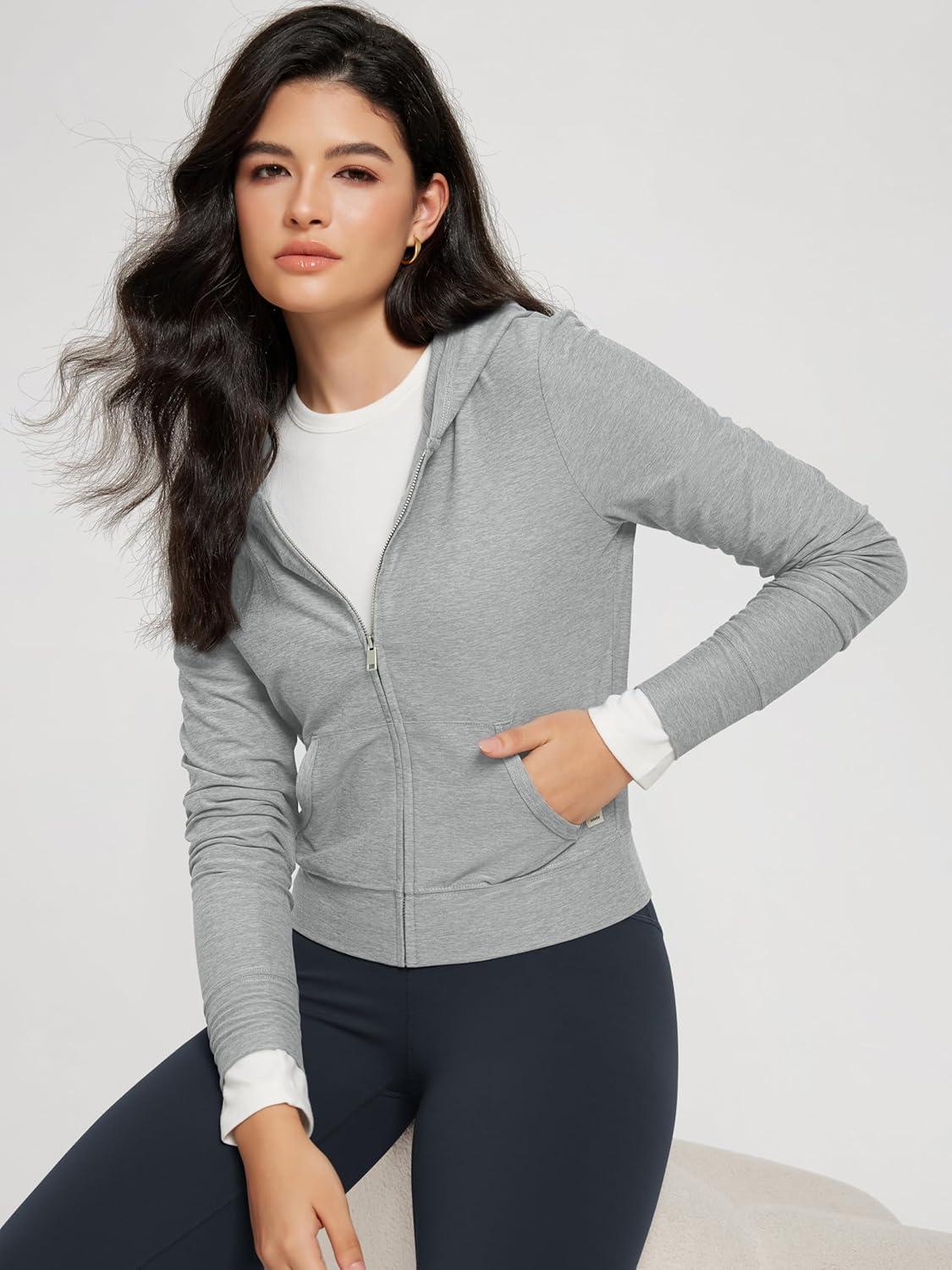 ODODOS Women's Full-Zip Cropped Hoodie – Stratum Tech Ultra Soft UPF 50+ Hooded Jacket with Pockets(Pale Grey Heather)