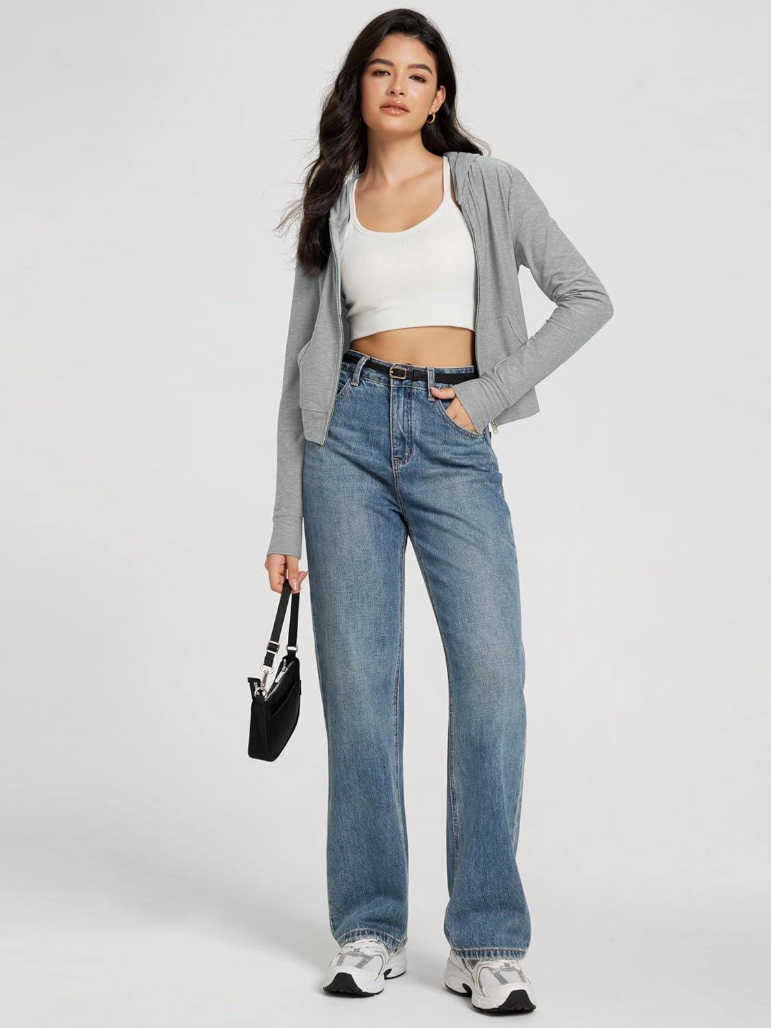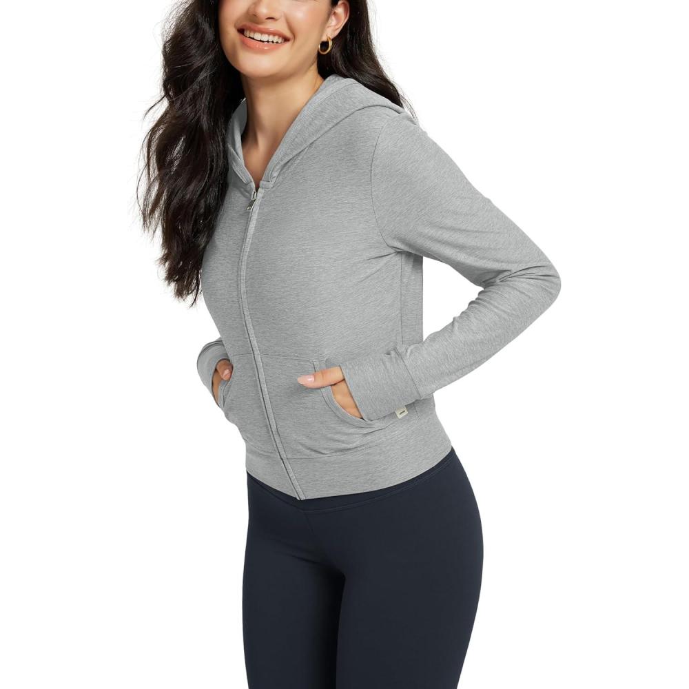 ODODOS Women’s Full-Zip Cropped Hoodie – Stratum Tech Ultra Soft UPF 50+ Hooded Jacket with Pockets(Pale Grey Heather)