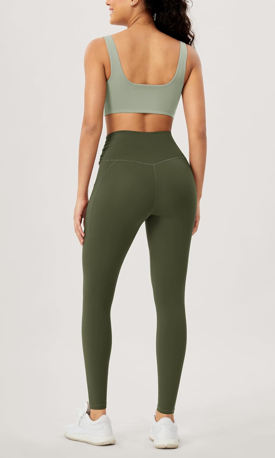 ODODOS Women’s Gathered Cross Waist Yoga Leggings with Pockets, 25″ / 28″ Crossover Workout Yoga Pants(Dark Olive)