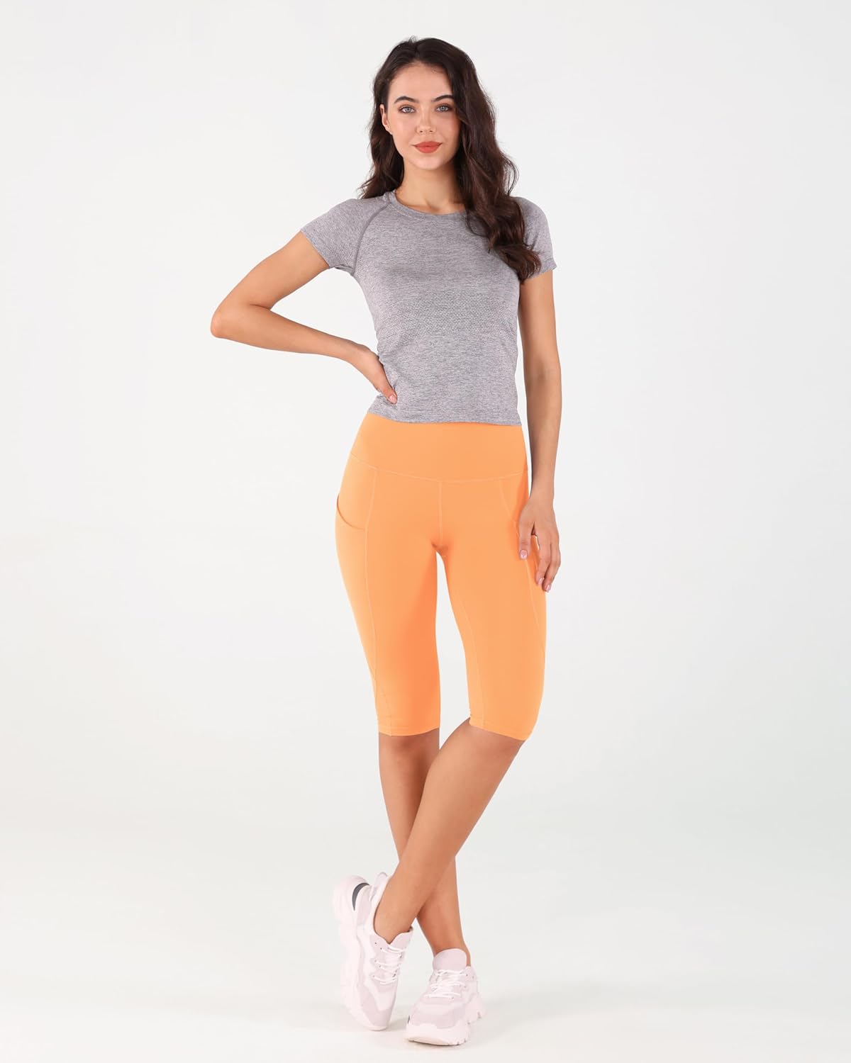 ODODOS Women’s High Waisted Yoga Capris with Pockets, Tummy Control Non See Through Workout Athletic Running Capri Leggings(Neon Orange)