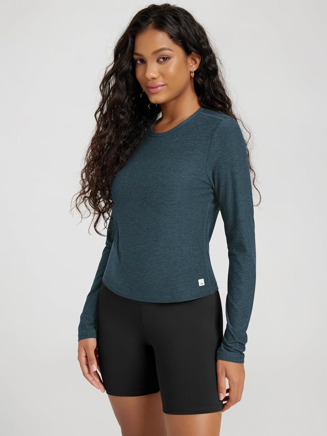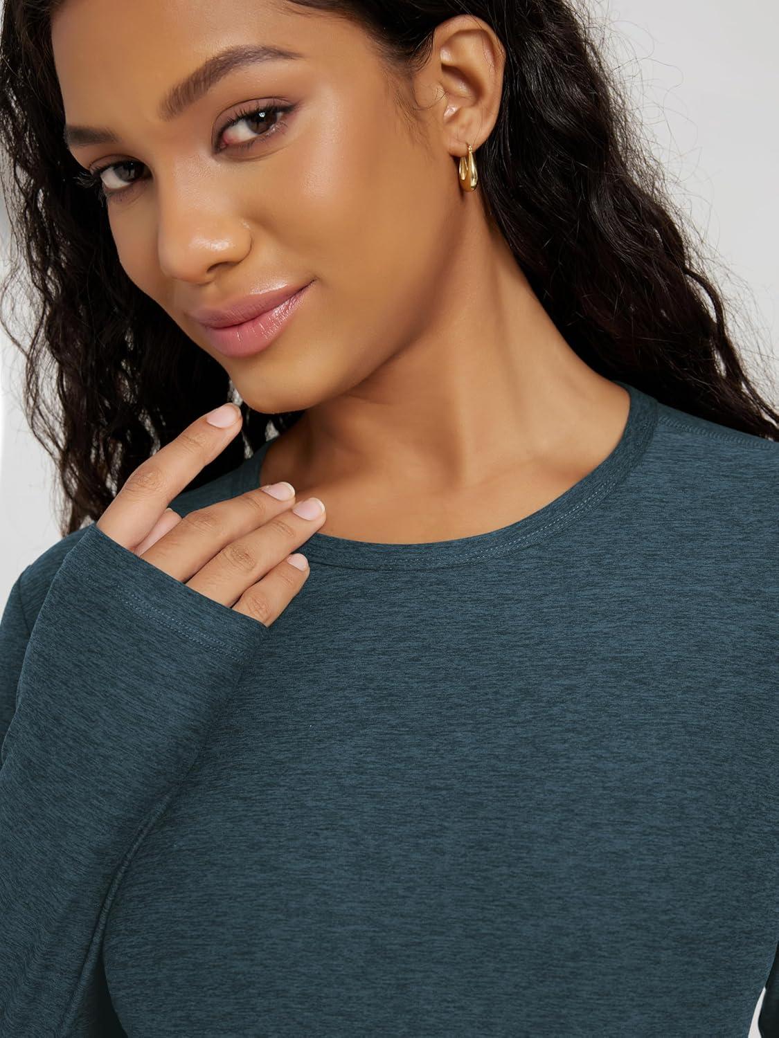 ODODOS Women's Long Sleeve Performance T-Shirts - Ultra Soft Stratum Tech Crew Neck Tee UPF 50+ Essential Crop Top(Navy Heather)