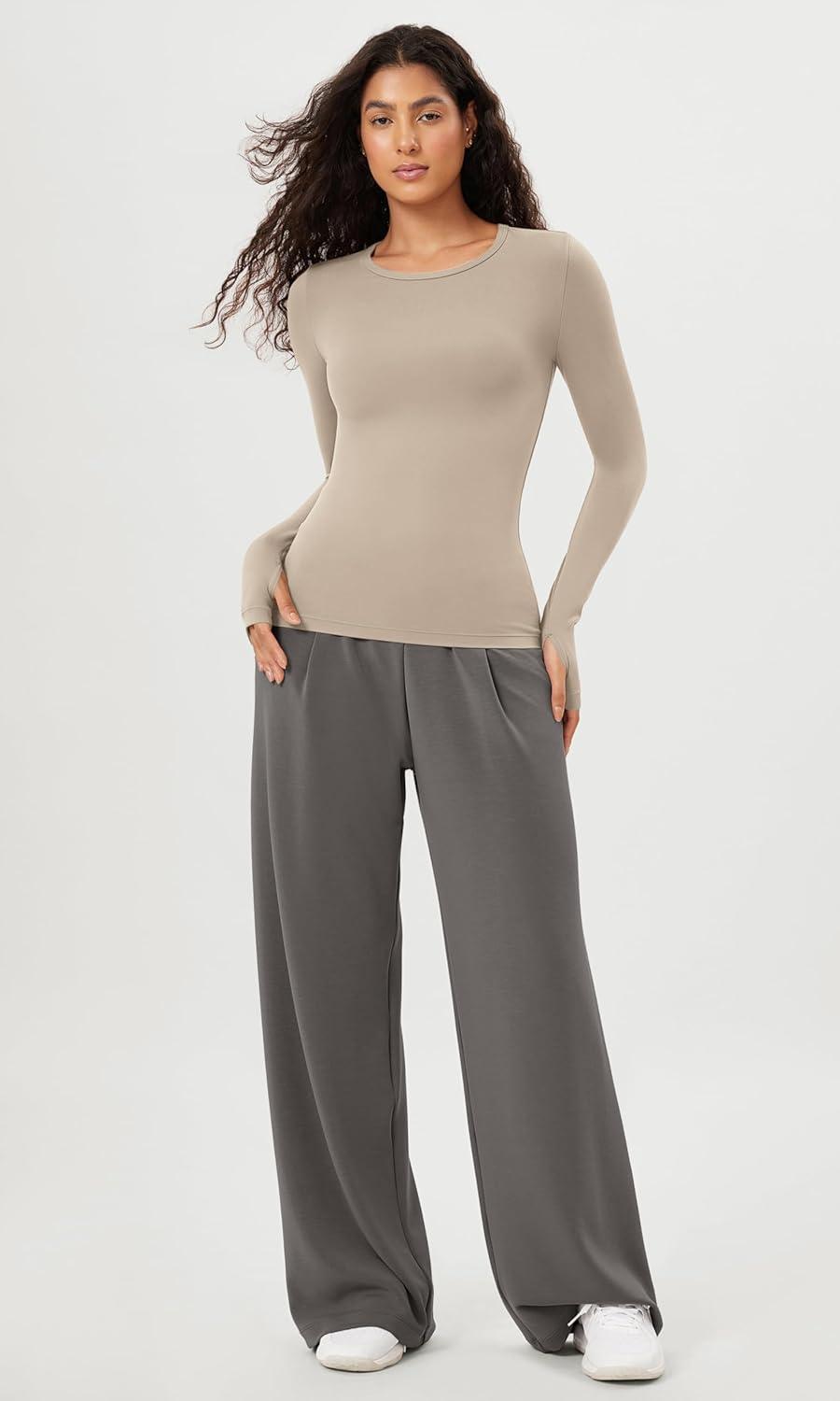 ODODOS Women’s Long Sleeve Shirts with Thumb Hole Cloud Feeling Soft Crew Neck Slim Fit Tee Yoga Athletic Workout Tops(Shaker Beige)