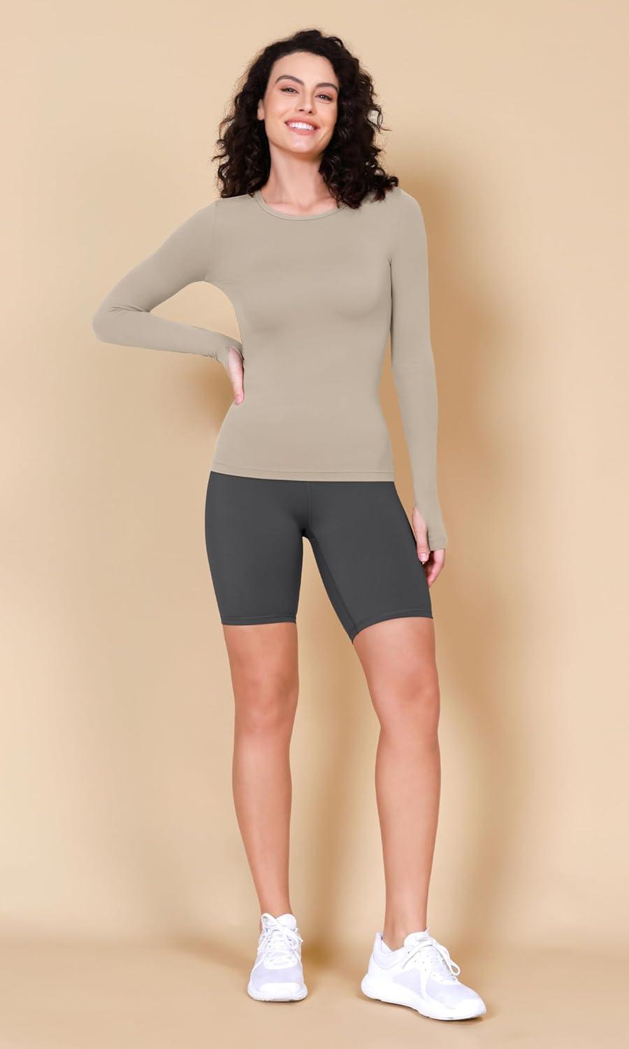 imageODODOS Womens Long Sleeve Shirts with Thumb Hole Cloud Feeling Soft Crew Neck Slim Fit Tee Yoga Athletic Workout TopsShaker Beige