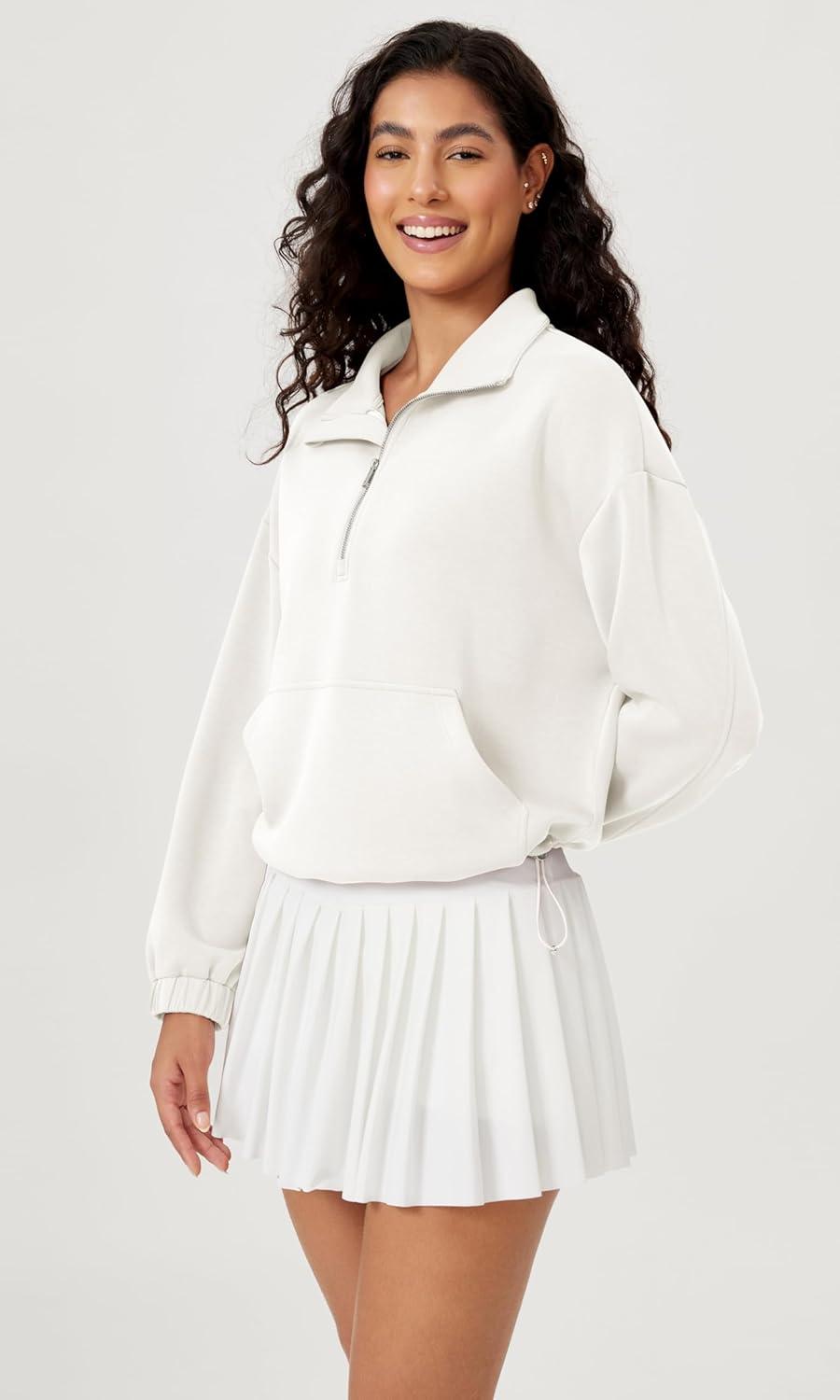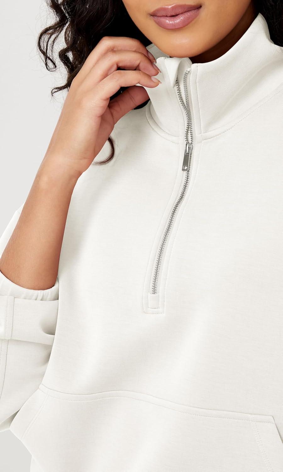 ODODOS Women’s Modal Soft Cinchable Sweatshirts Half Zipper Funnel Neck Oversize Pullover with Pockets(White)