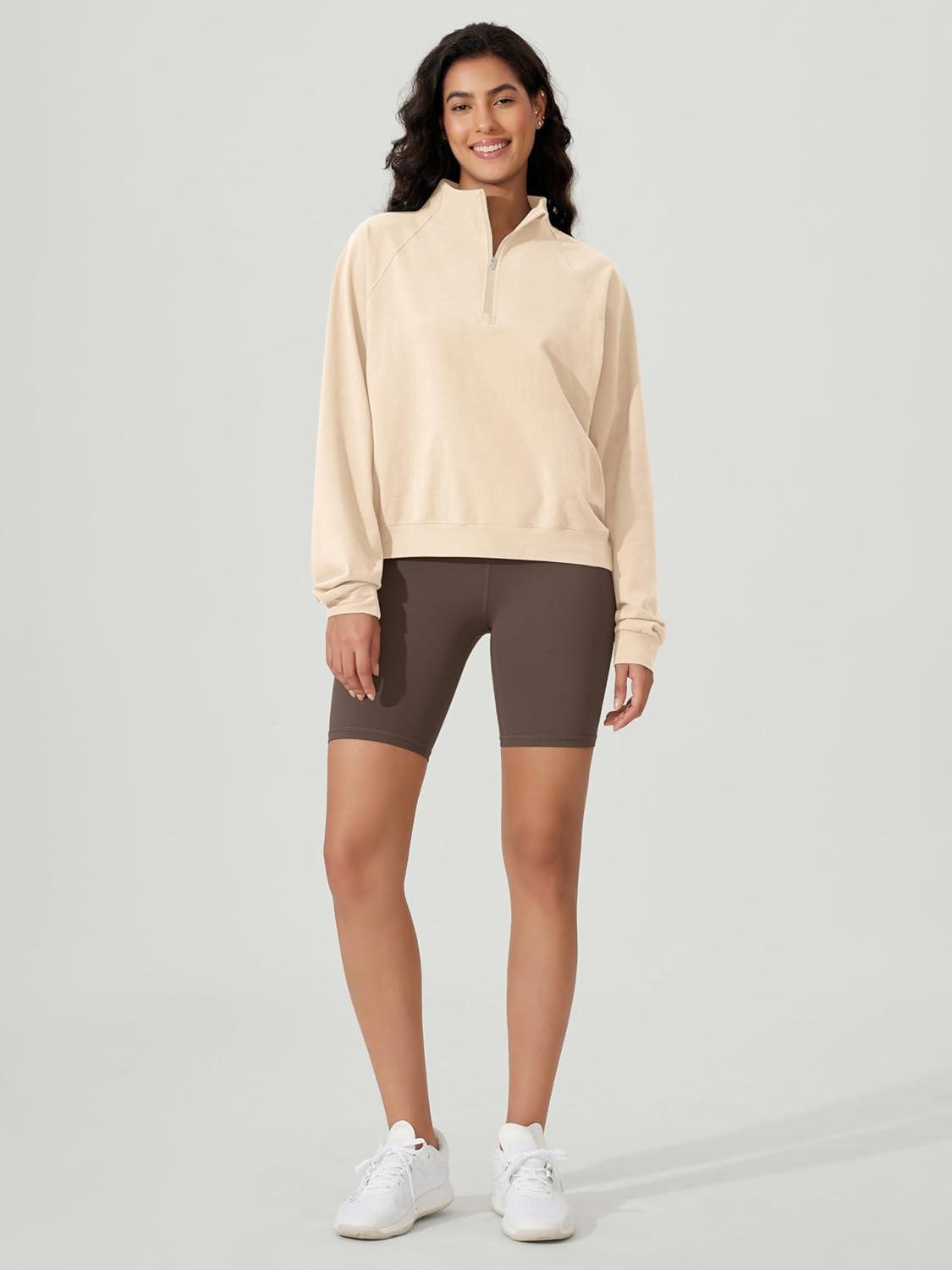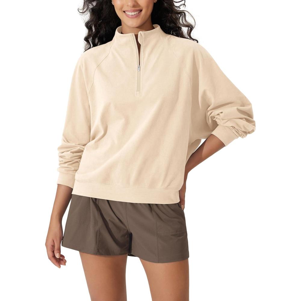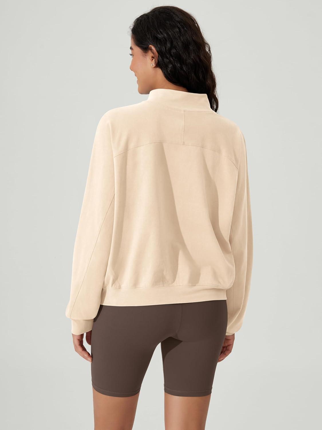ODODOS Women’s Purevibe Cotton Half-Zip Pullover Funnel Neck Sweatshirts Long Sleeve Tops(Beige)