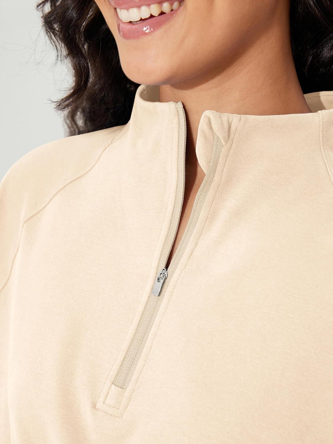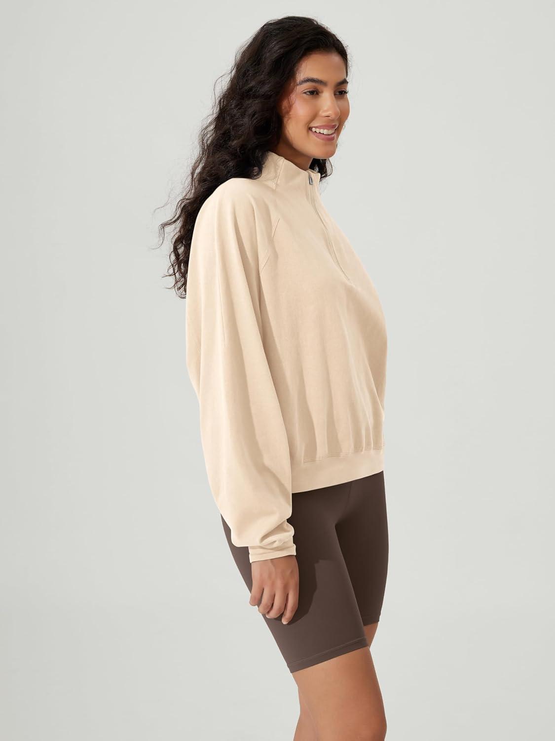 ODODOS Women's Purevibe Cotton Half-Zip Pullover Funnel Neck Sweatshirts Long Sleeve Tops(Beige)
