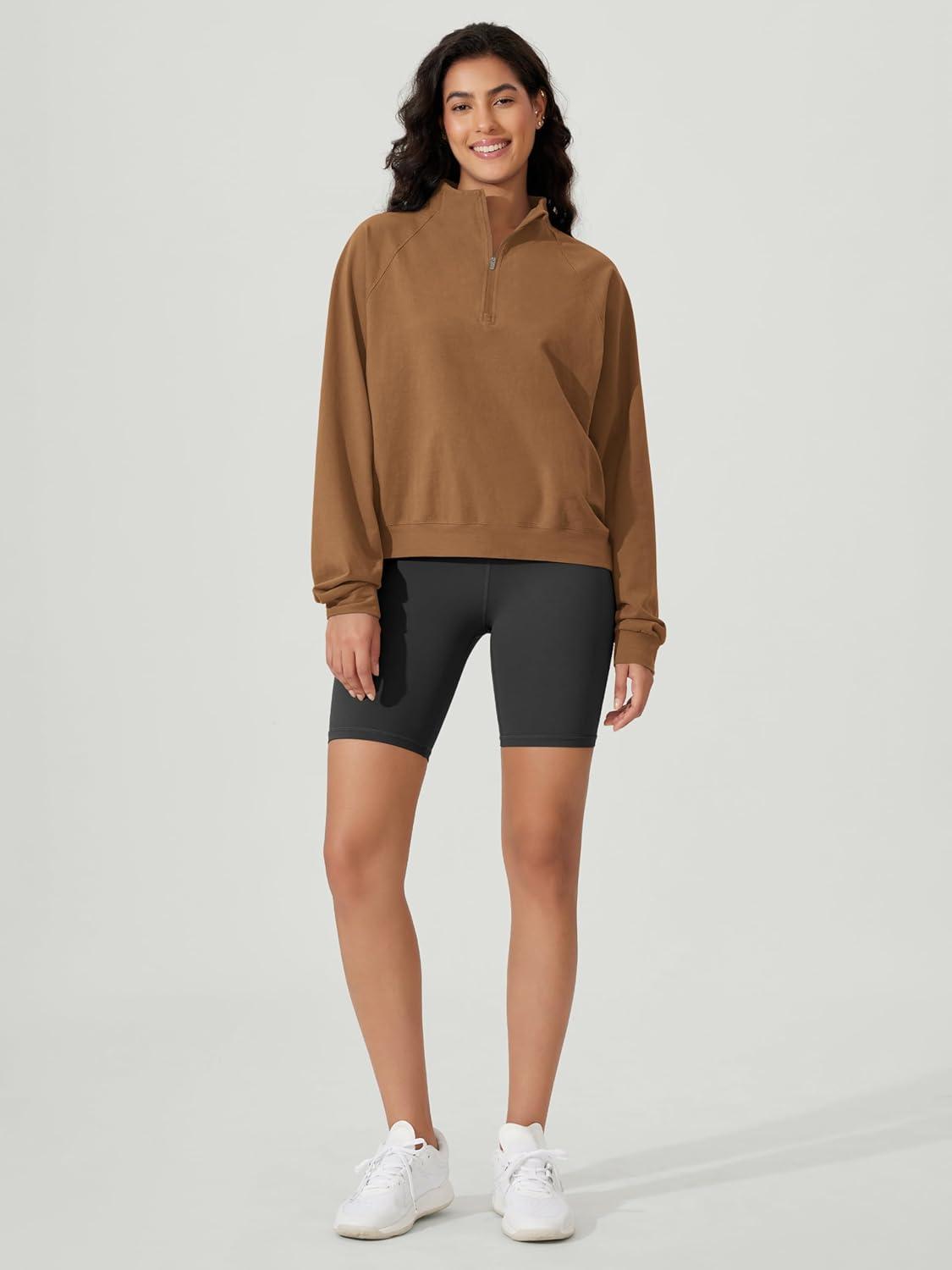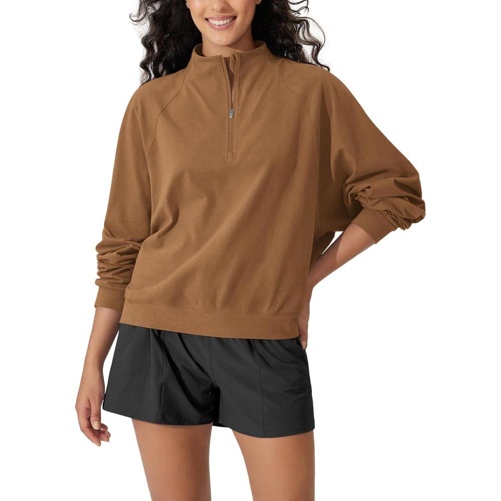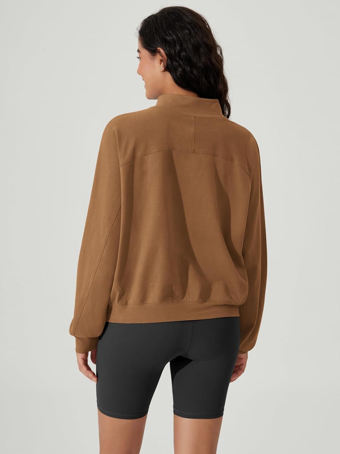 ODODOS Women’s Purevibe Cotton Half-Zip Pullover Funnel Neck Sweatshirts Long Sleeve Tops(Brown)