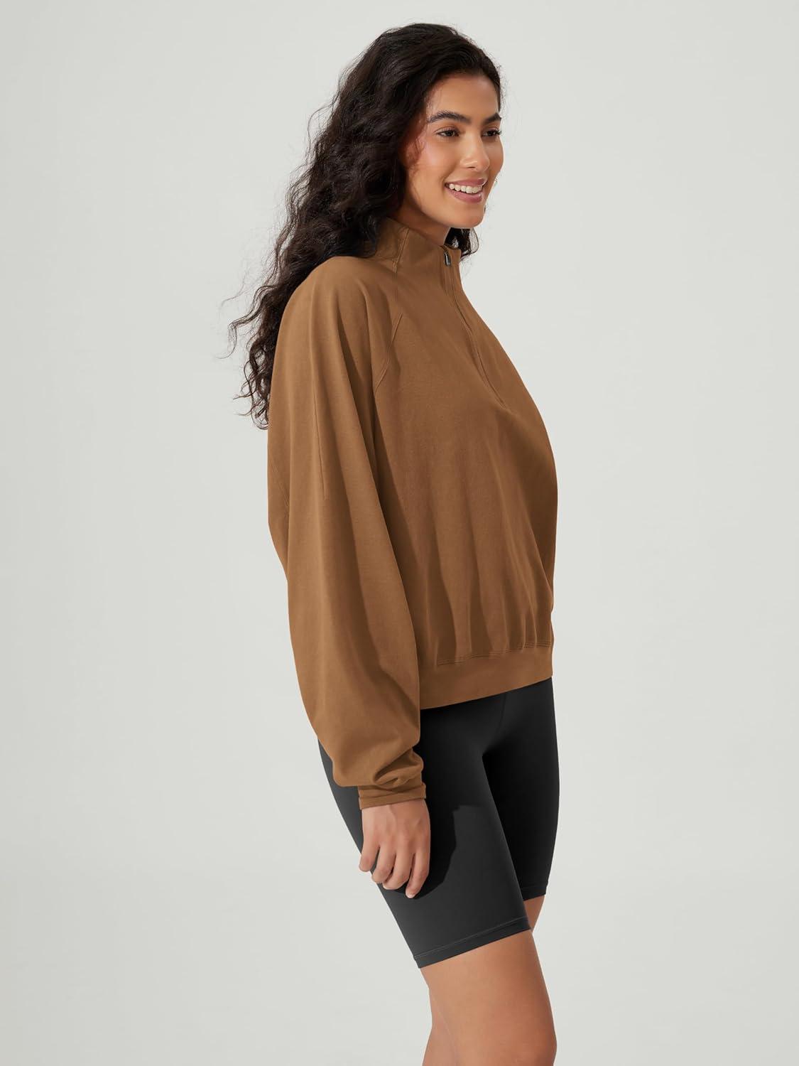 ODODOS Women's Purevibe Cotton Half-Zip Pullover Funnel Neck Sweatshirts Long Sleeve Tops(Brown)