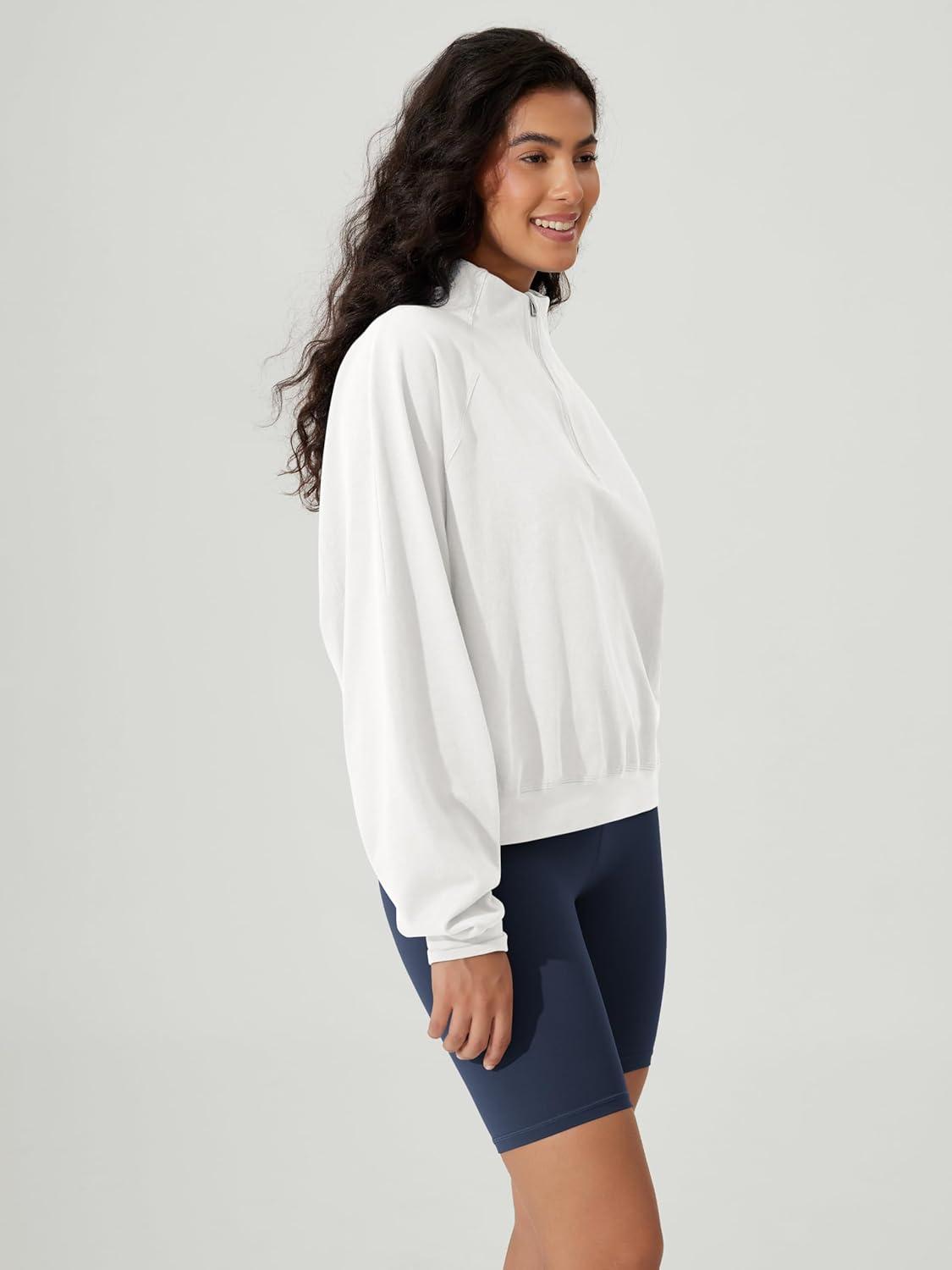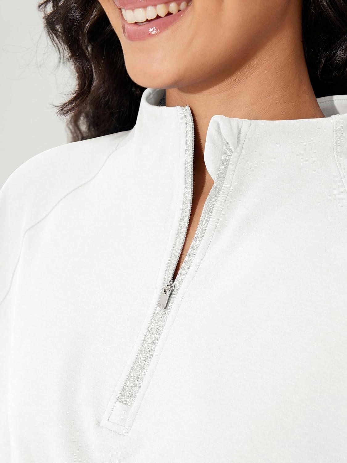 ODODOS Women's Purevibe Cotton Half-Zip Pullover Funnel Neck Sweatshirts Long Sleeve Tops(White)