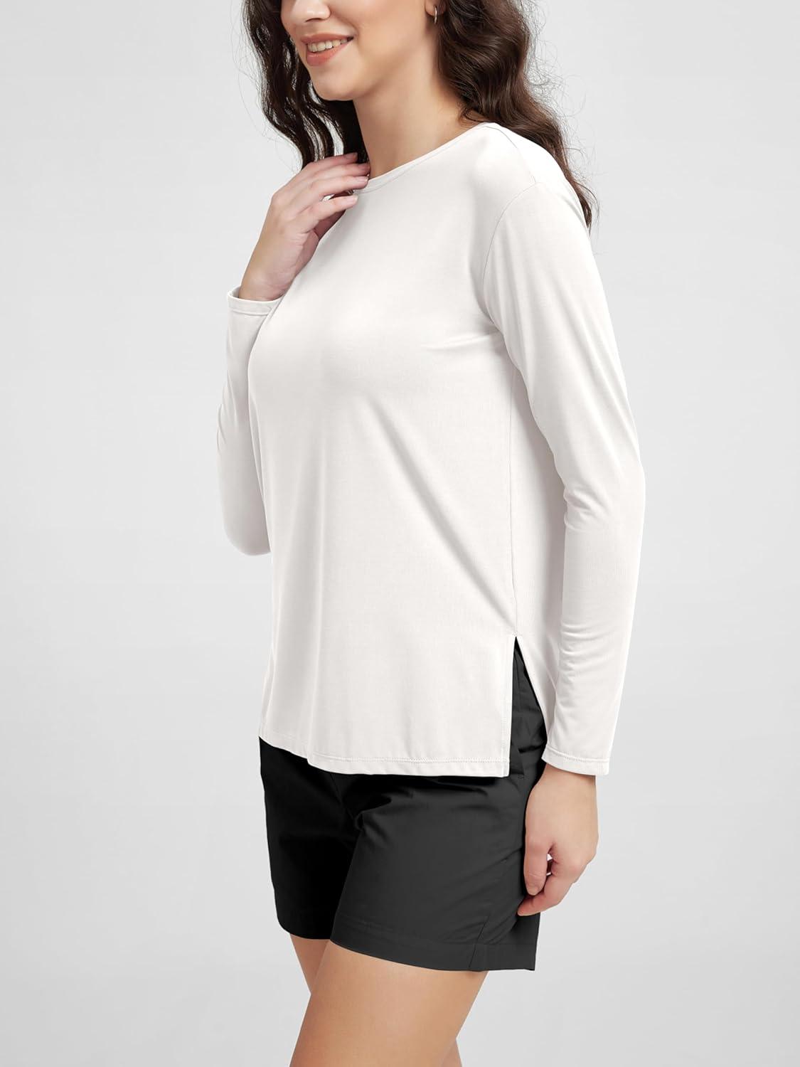 ODODOS Women's Relaxed Fit Long Sleeve Shirts Boat Neck Side Slit Peach-Soft Casual Lounge Yoga Tops(Milk White)