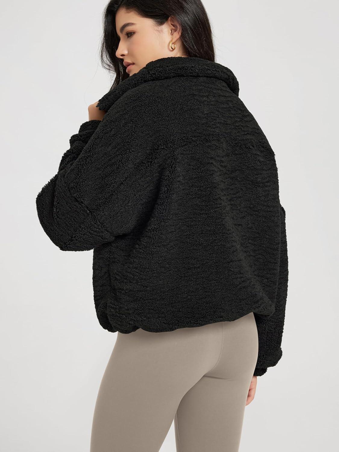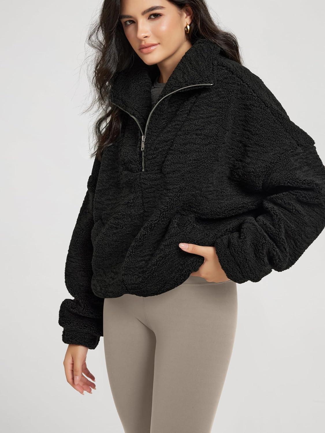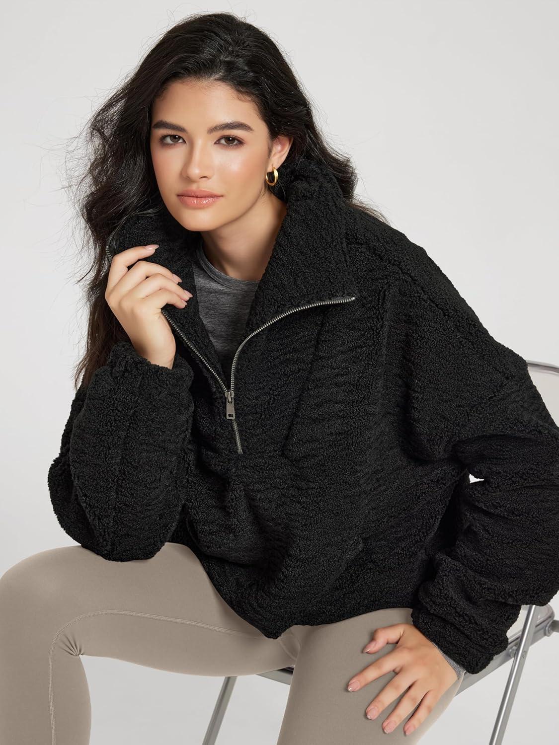 ODODOS Women's Sherpa Fleece Half-Zip Pullover - Cozy Warm Long Sleeve Sweatshirt Cinchable Outerwear with Pockets(Black)