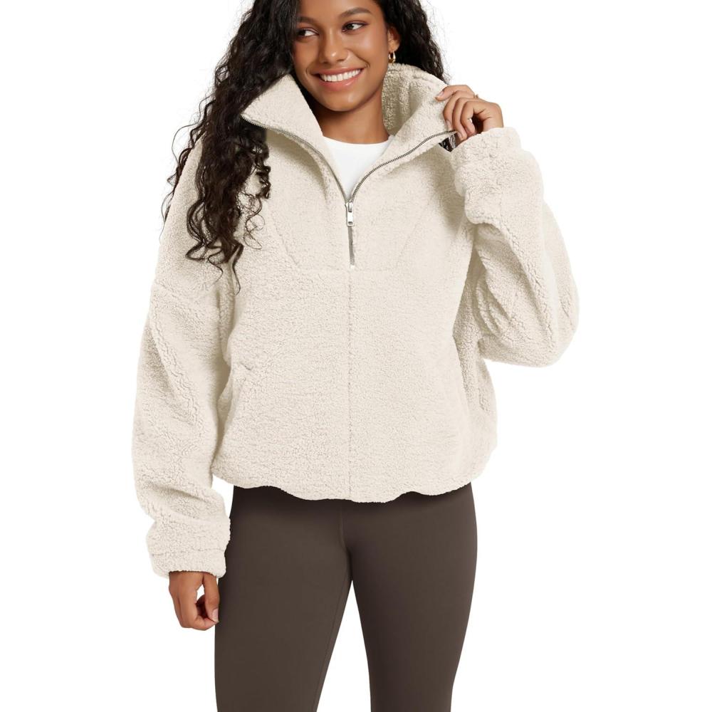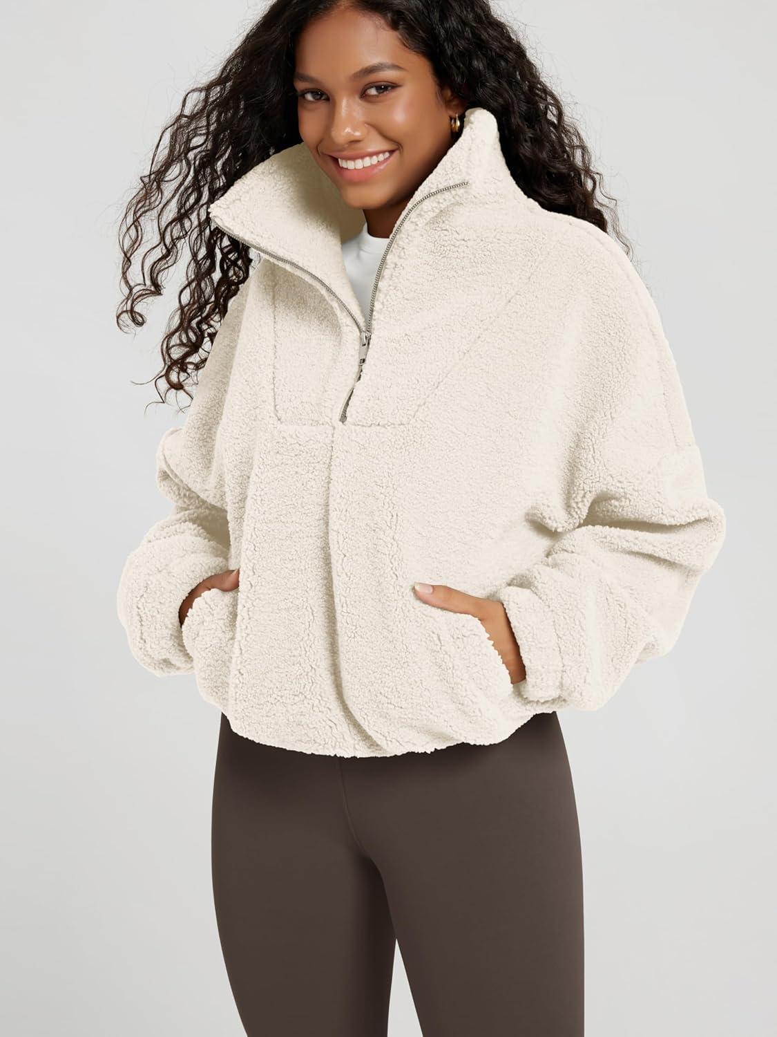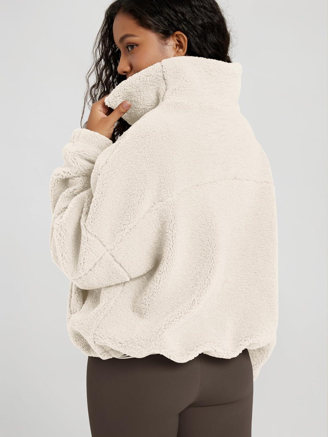 ODODOS Women’s Sherpa Fleece Half-Zip Pullover – Cozy Warm Long Sleeve Sweatshirt Cinchable Outerwear with Pockets(Ivory)